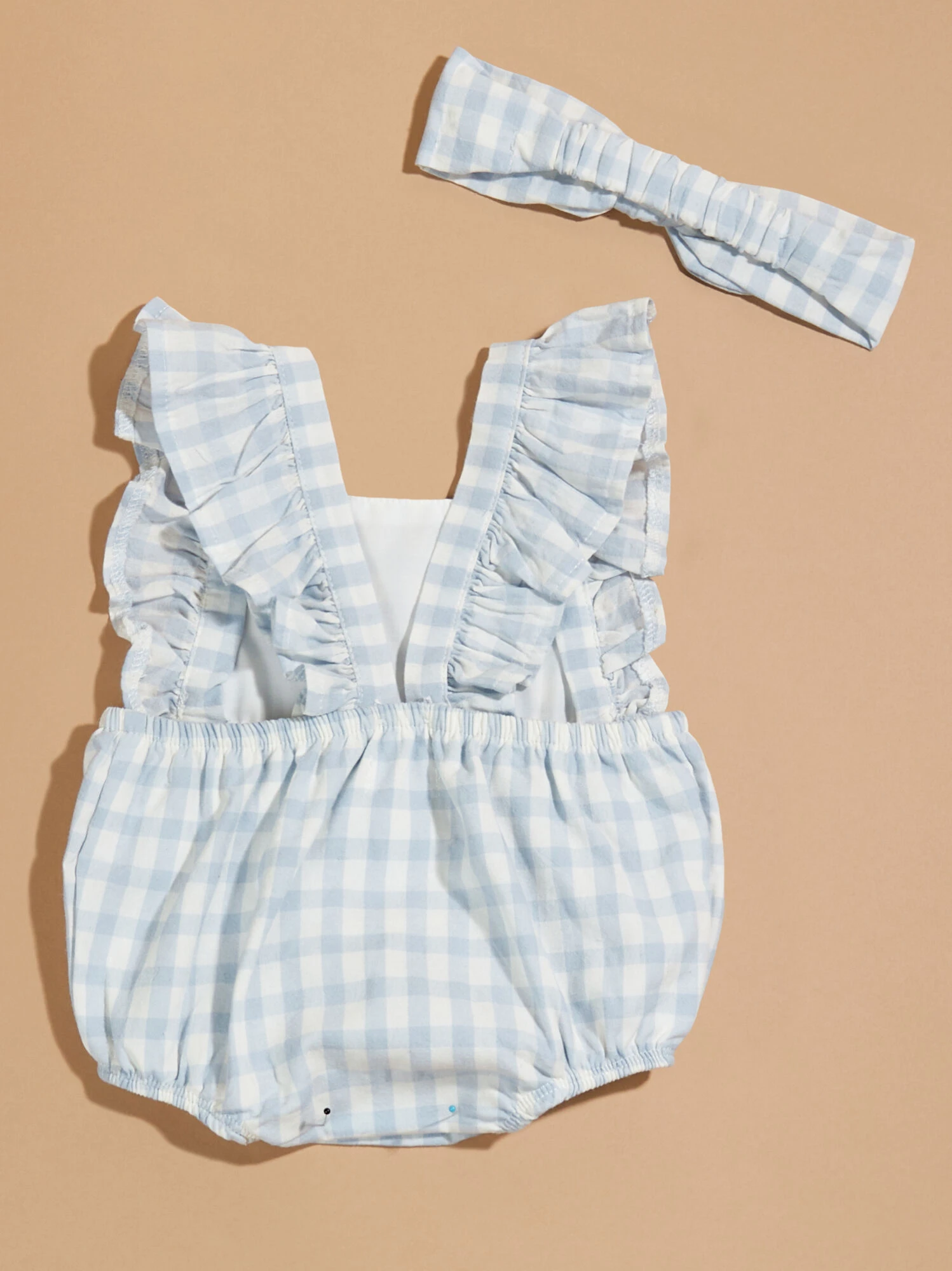 This MudPie gingham bubble features a playful checkered print and comfy snaps at the bottom for easy diaper changes. Adjustable button ruffle straps ensure a perfect fit, while the matching headband bow completes the adorable look.