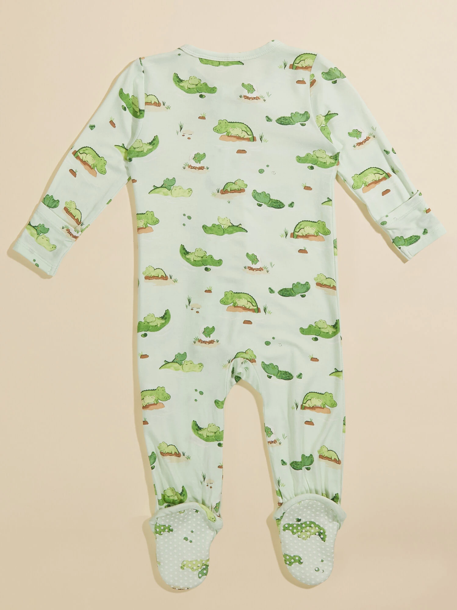Dress your babe in soft comfort for bedtime with this alligator print footie made from eco-friendly bamboo material to provide a lightweight, breathable feel. The fold over hand cuffs, non-slip foot grips, and two-way zipper meet all the practical needs of you and your mini.