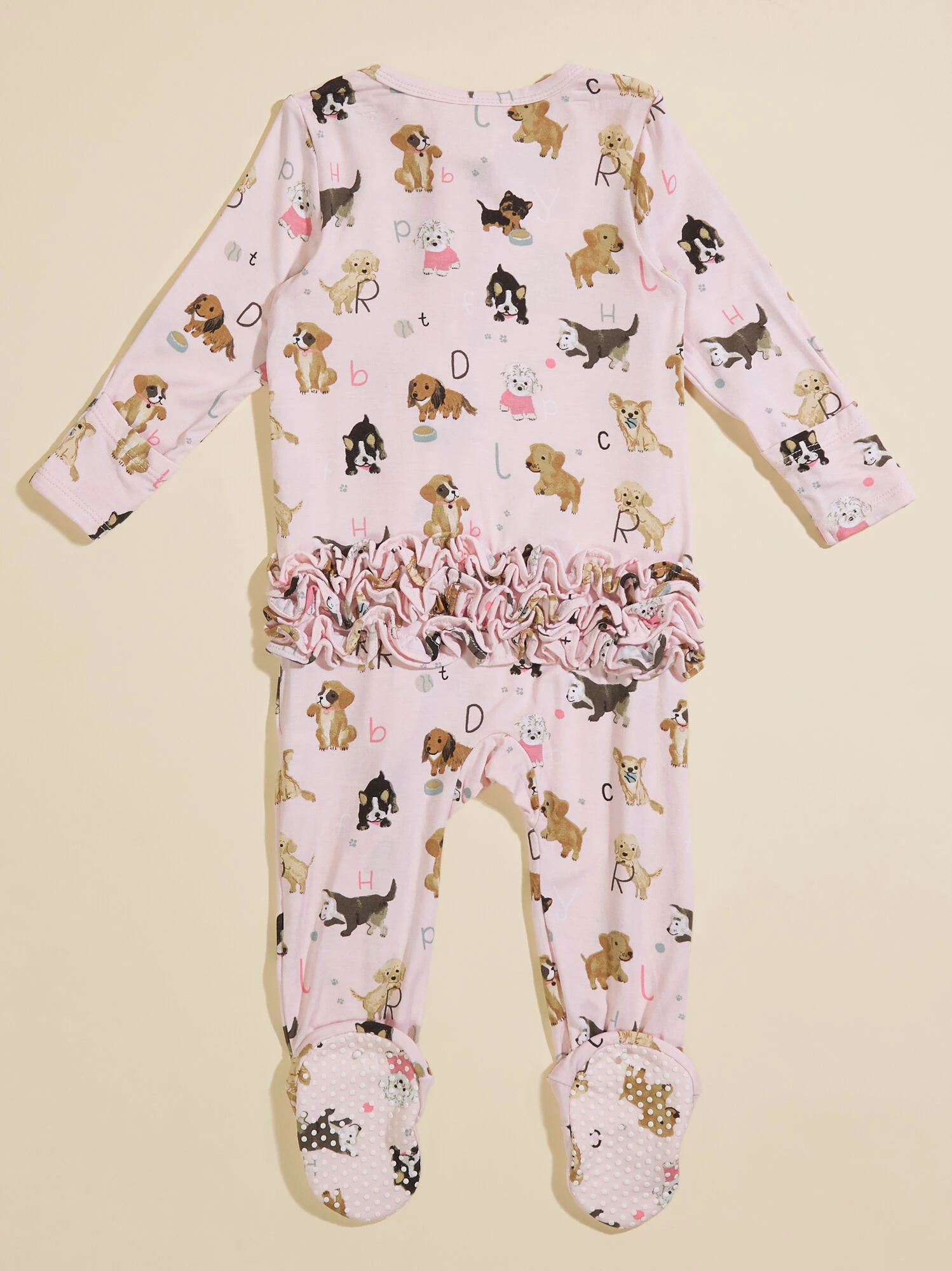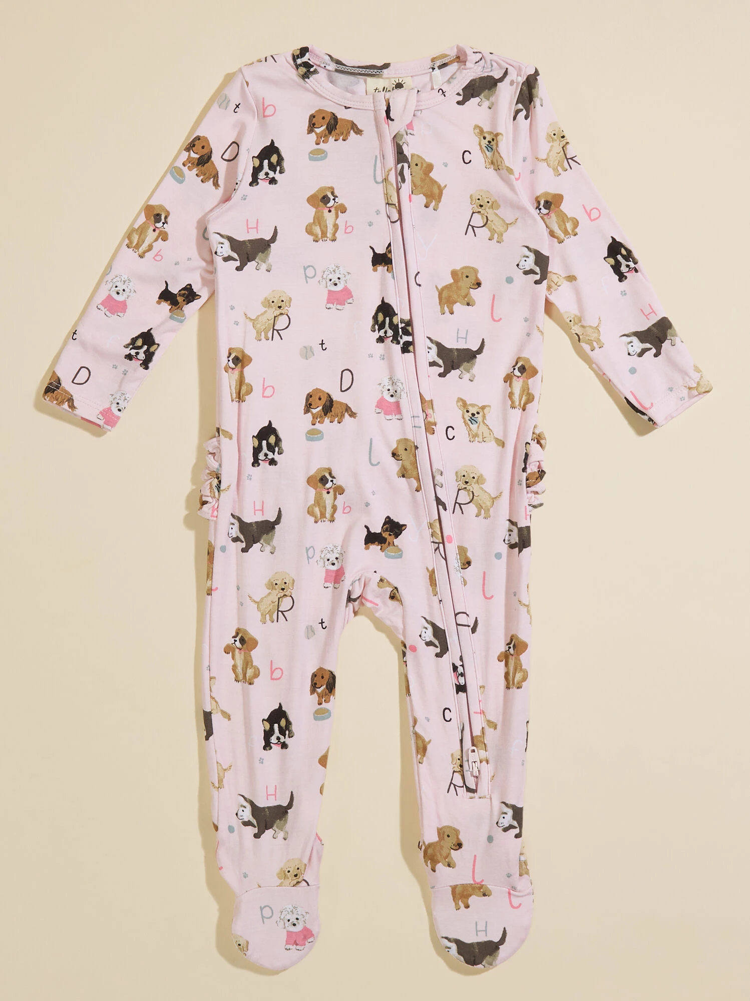This adorable puppy-themed footie features an alphabet pattern and playful ruffles on the back. Crafted from soft, eco-friendly materials, this footie ensures your babe’s comfort while also being gentle on the environment. Complete with hand cuffs, foot grips, and a convenient two-way zipper closure, it’s designed for practicality and ease during those precious early months.