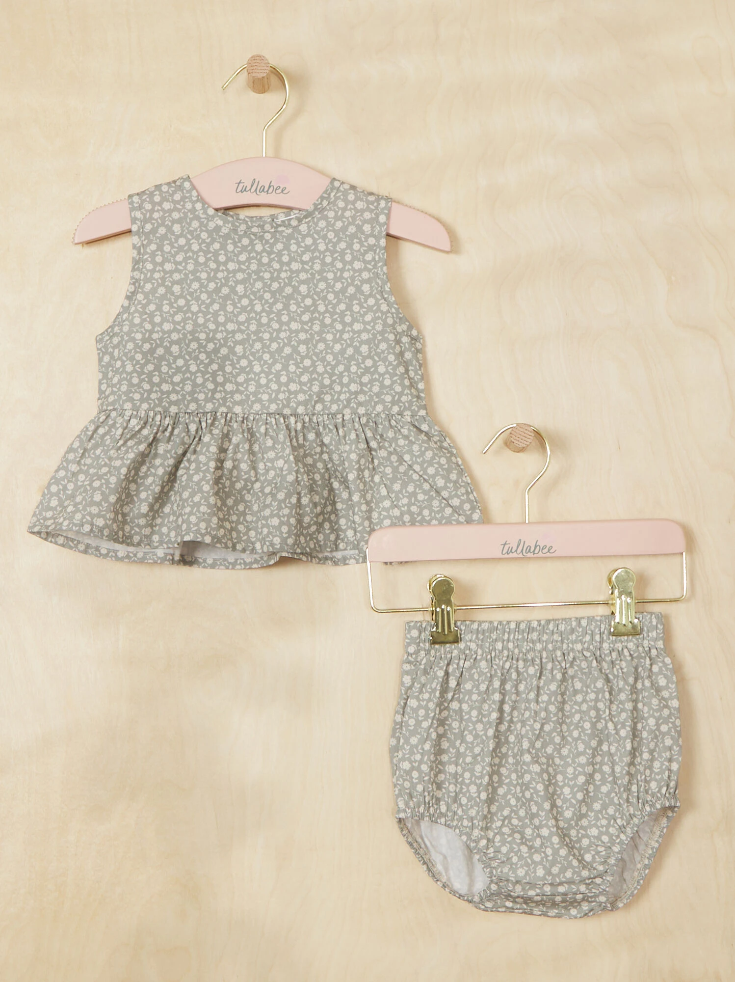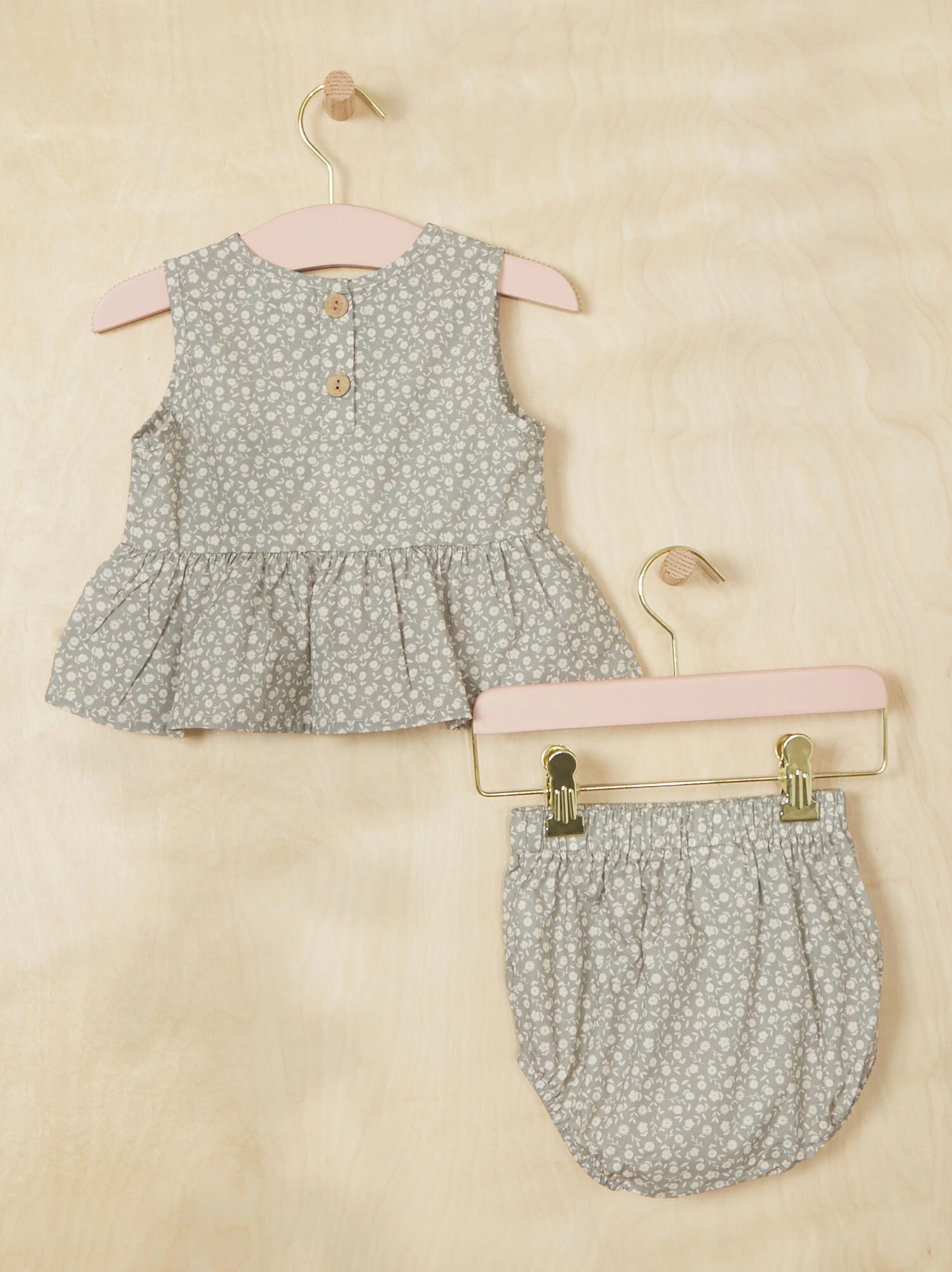 This adorable set with its delicate floral pattern and flowy design, is the perfect ensemble for your little one’s summer outings with mama. The top features a gathered waistline for an elegant look with a button back detailing for easy dressing, while the matching bloomers have an elastic waistband for an effortless stretch.