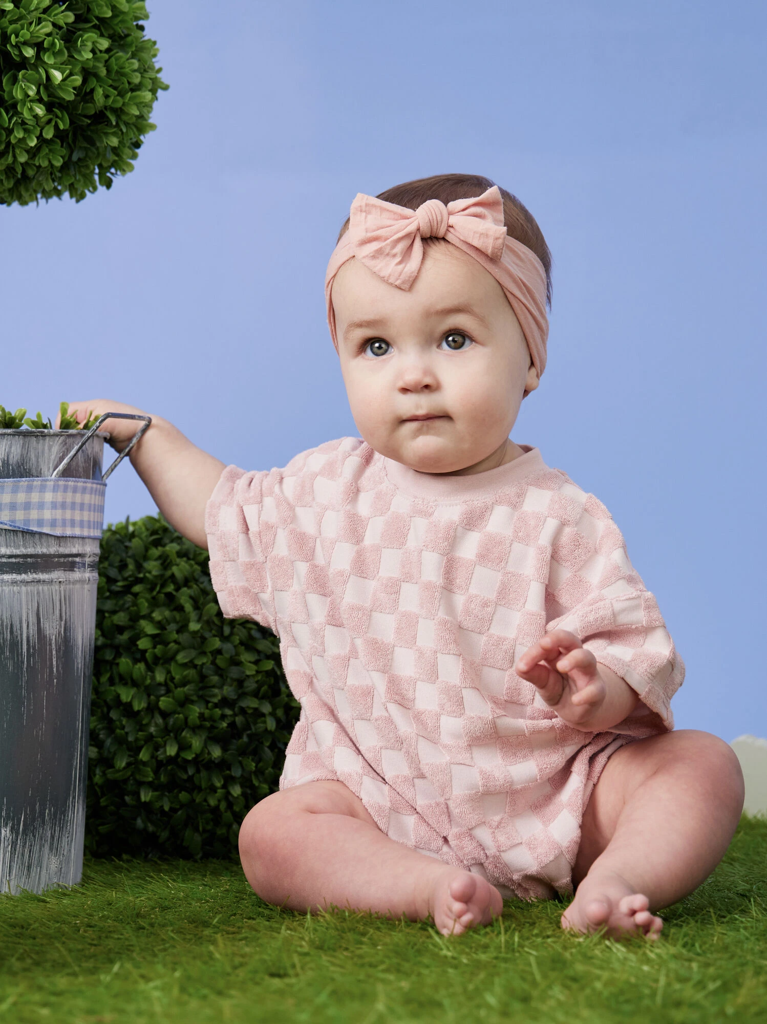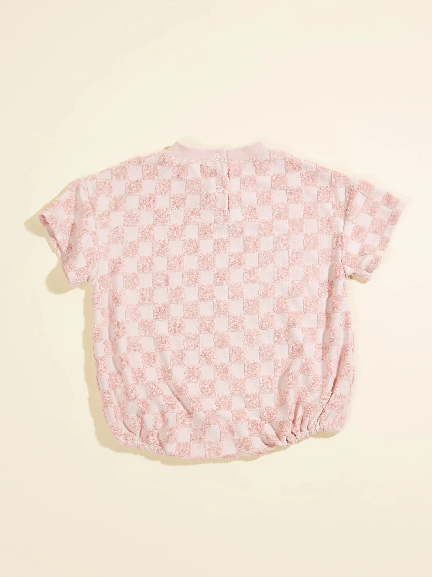 Perfectly soft and stretchy, this easy one and done outfit is an everyday staple for your babe. The checkered fabrication has a soft pile, while the crewneck and bubble design gives an adorable silhouette sure to be oh-so cute on your little.