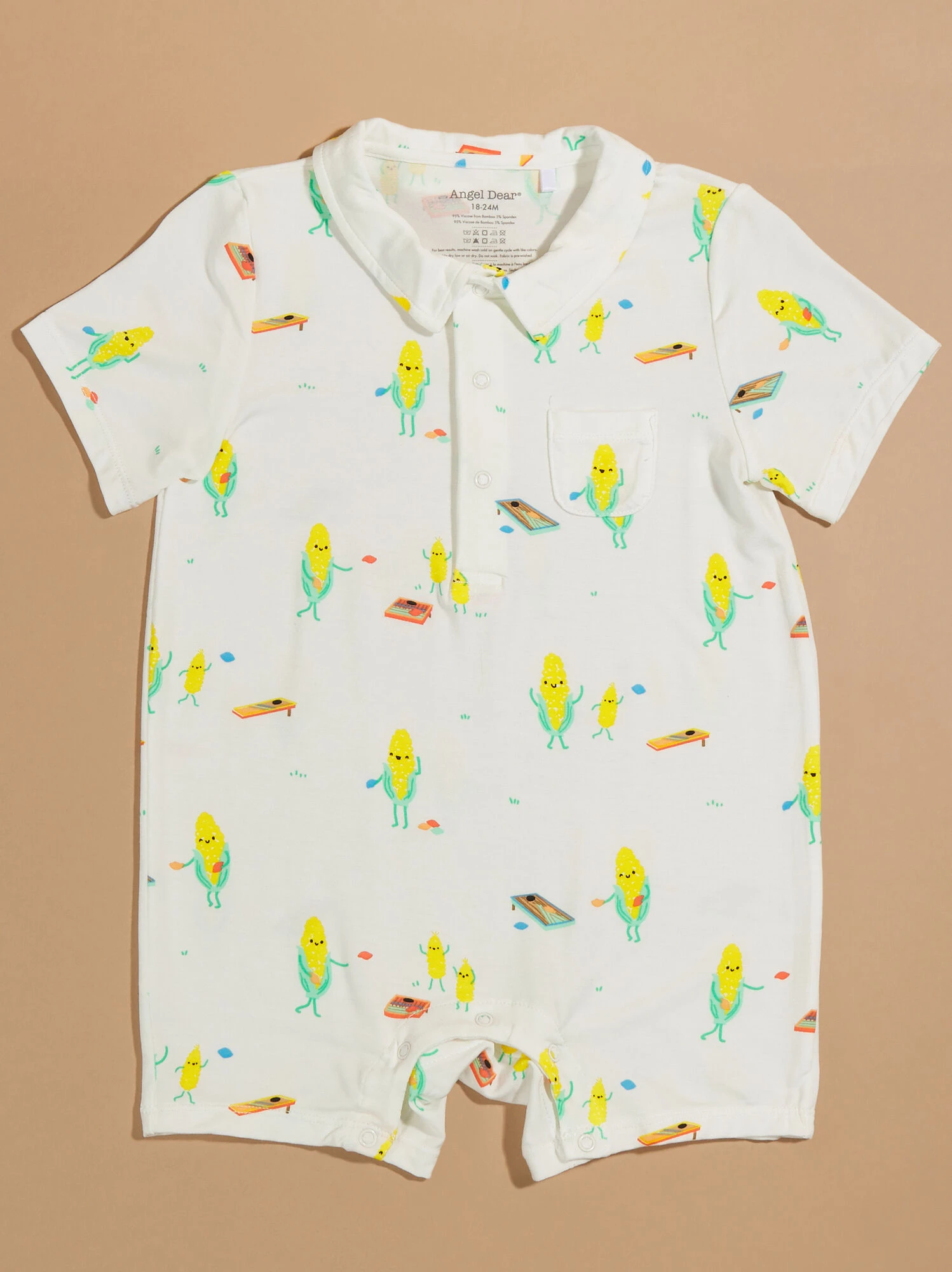 Dress your babe in soft comfort for all activities in this playful cornhole inspired jumper, made from eco-friendly bamboo material to provide a lightweight, breathable feel. This polo style one-piece features a small front pocket and snaps for easy changes.