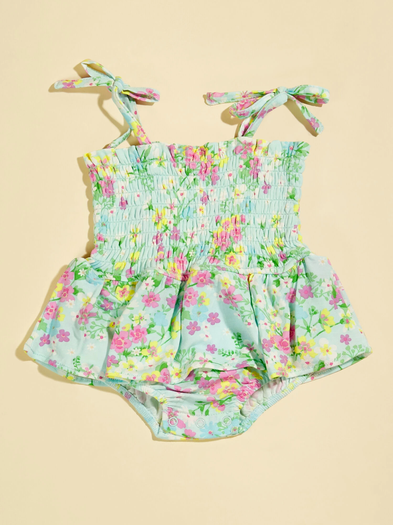 This bubble offers vibrant pops of color and a dainty floral print making the cutest playful one-piece for sunny weather days with your girl. The smocked bodice and gathered skirt layer offer an adorable fit, while the buttery soft eco-friendly material ensures a lightweight stretch for easy movement during play.
