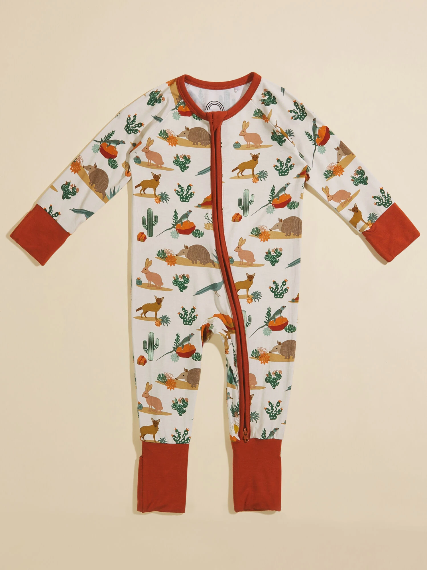 This desert print sleeper is the coziest one-piece for your little carefully crafted from bamboo, eco-friendly fabric for a breathable, lightweight feel. With a two-way zipper for easy changes, and fold over hand and foot cuffs to prevent accidental scratches, this sleeper meets all your practical needs.