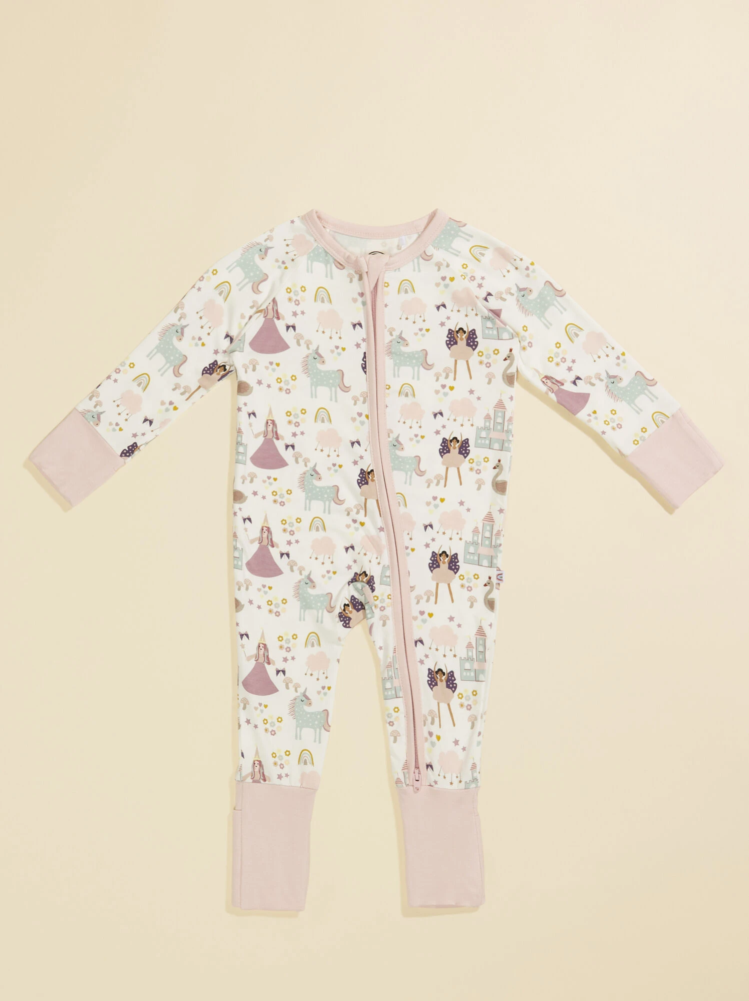 Captivate your girl’s imagination for a night of sweet dreams with this buttery soft sleeper featuring a magical print with fairies and princess friends. The eco-friendly fabric from bamboo, two-way zipper for easy changing, and fold over hand and foot cuffs for extra security makes this sleeper the best pick for comfort and ease.
