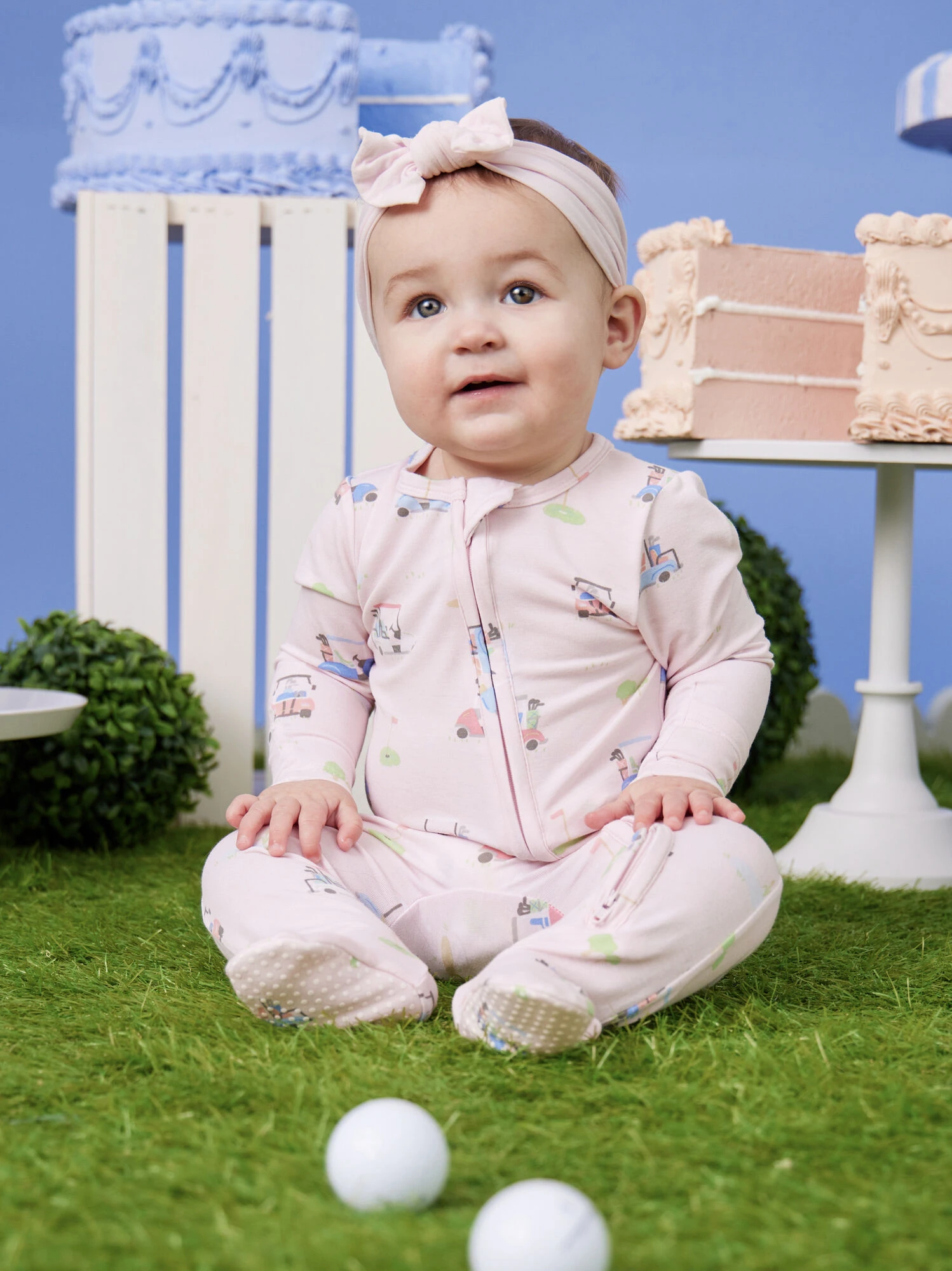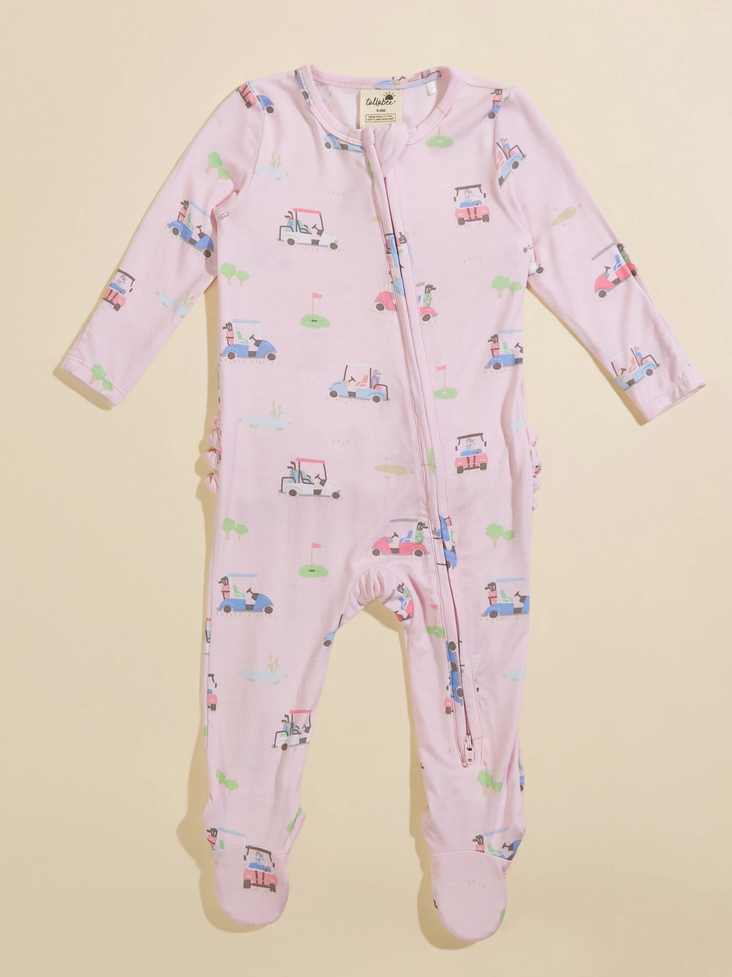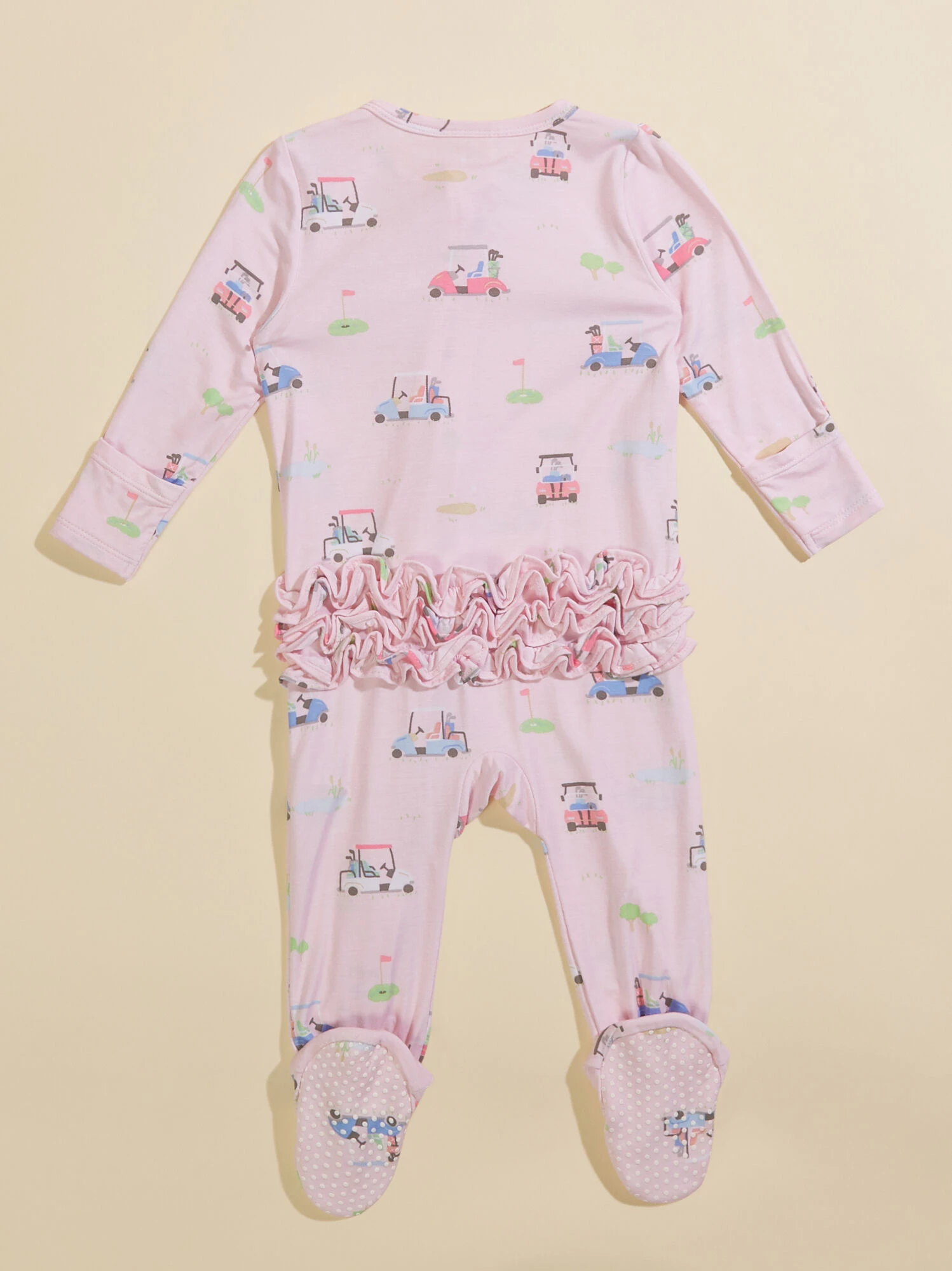 Keep your little cozy for bedtime in this footie featuring a ruffle booty design and golf inspired print for an adorable sporty look. The buttery soft eco-friendly fabric from bamboo provides lightweight, breathability, while the two-way zipper creates easy access for diaper changes. With fold over hand cuffs and non-slip foot grippers, this footie meets all your babe’s practical needs.