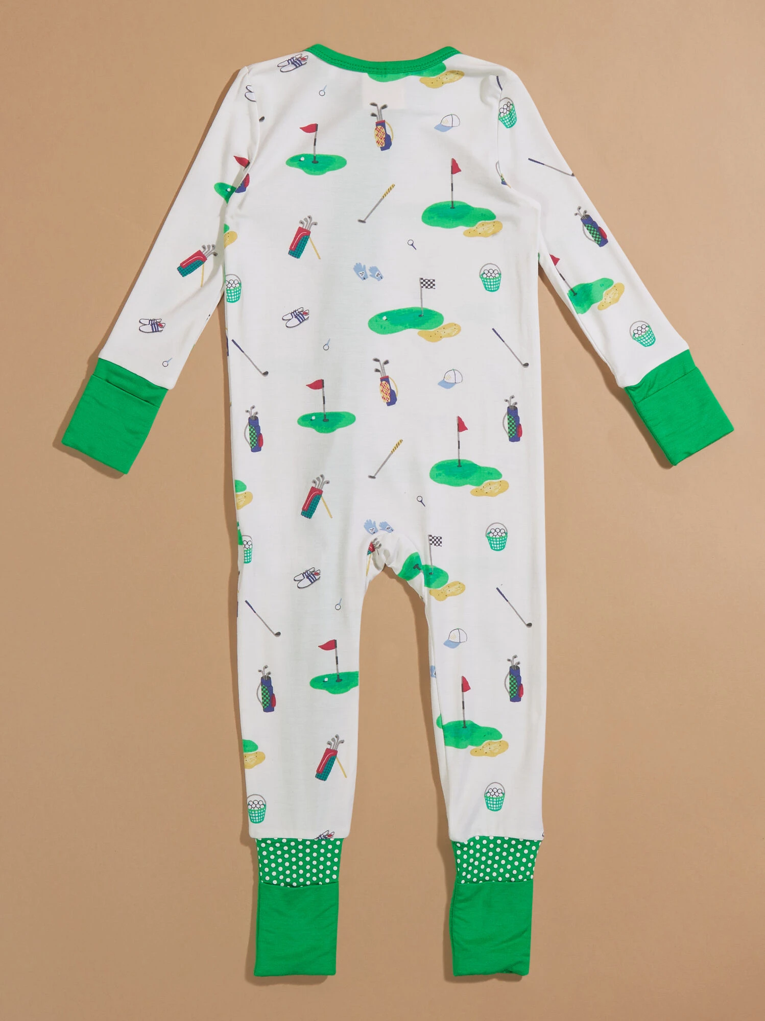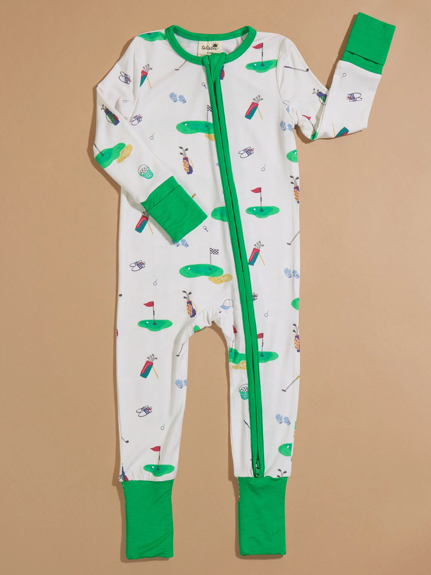 This cozy sleeper is designed with your babe’s comfort in mind, featuring fold-over hand and foot cuffs with handy grips for added warmth and security. With a convenient two-way zipper closure, it ensures quick and easy changes, making bedtime routines a breeze. Adorned with charming golf-themed designs, it adds a touch of playful style to your little one’s sleepwear collection.