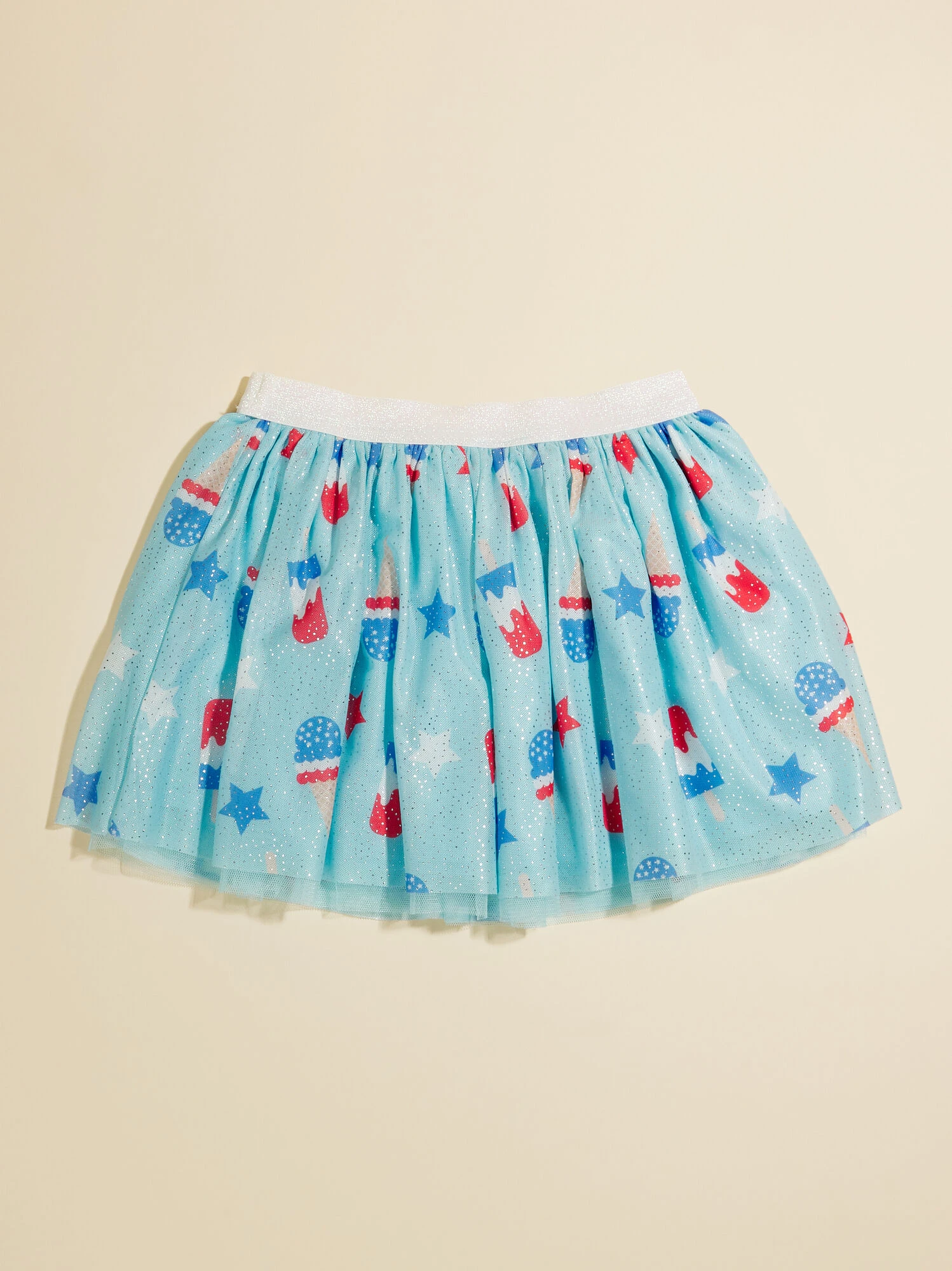 Add some glam to your girl’s look with this sparkly tutu featuring a playful ice cream pop print in a July 4th inspired design. The soft lining provides a gentle feel against your girl’s skin, while the glitter covered elastic waistband offers an easy slip on style.