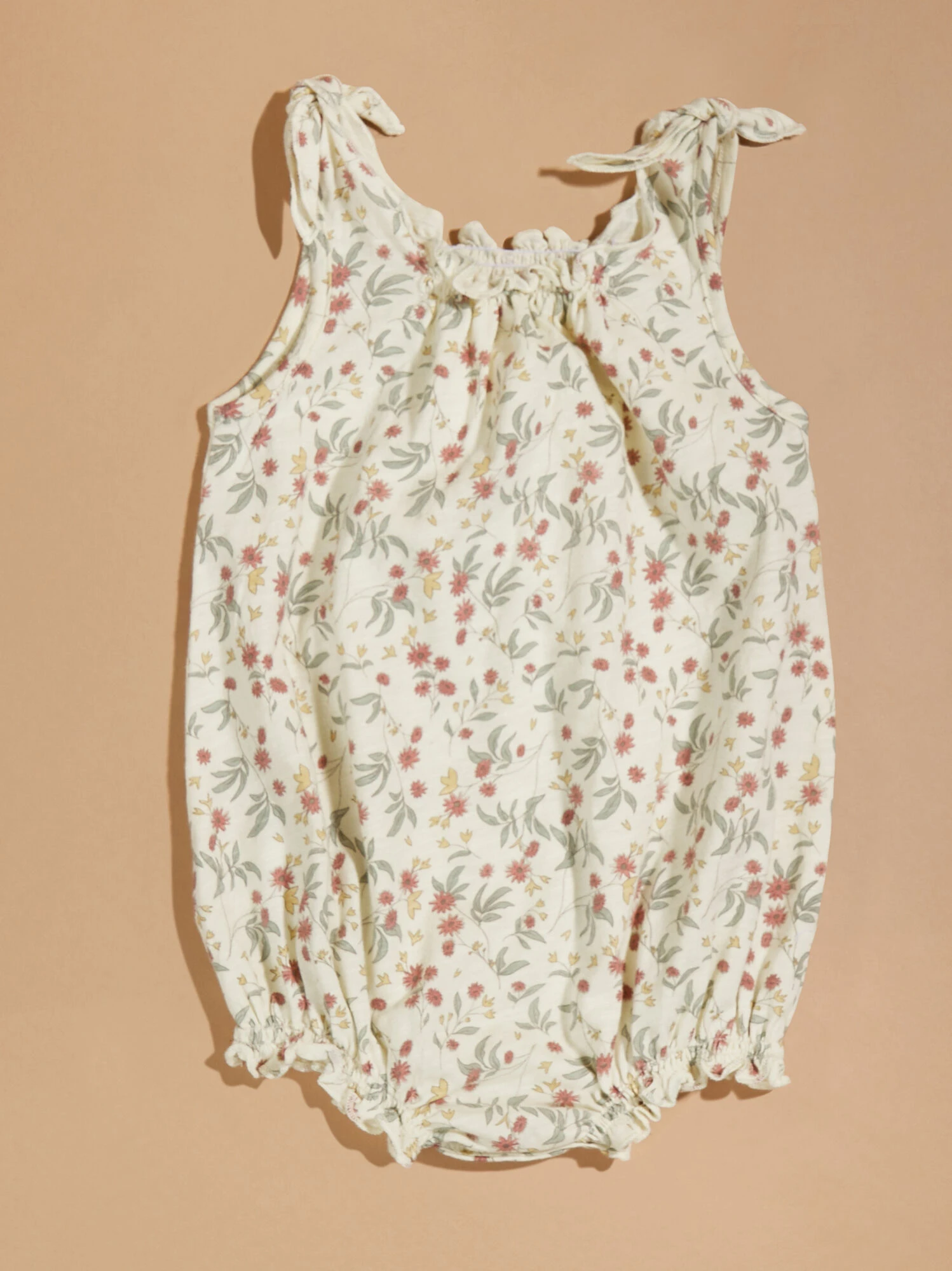 This sweet bubble is perfect for all-day adventures with your little babe with it’s lightweight, soft material for ultimate comfort. The adjustable ties on the sleeves offer added flexibility and style, while the floral print and smocked neckline and leg hole detailing instantly elevate this style for your girl.