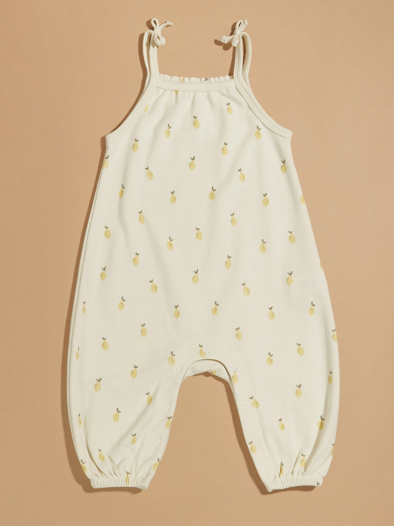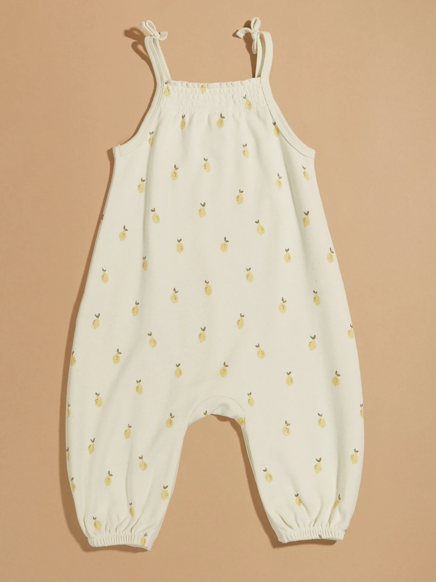 For a sweet summer style that prioritizes your little’s comfort, this all in one outfit offers a buttery soft feel and a dainty lemon print. The smocked back, fixed tie straps, and elastic leg openings add the cutest details while providing easy changes with the stretchy design features.
