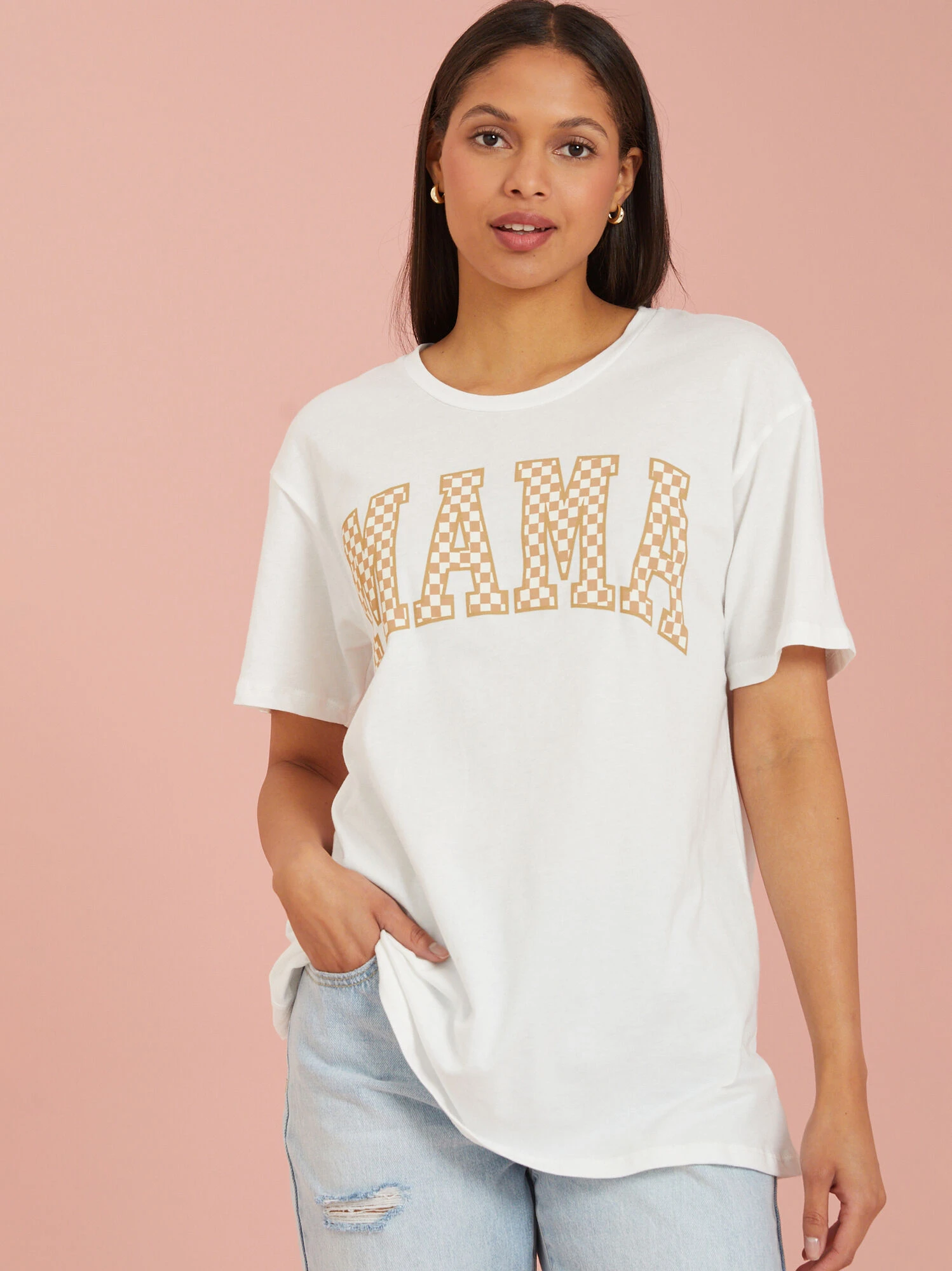 Perfectly versatile for everyday wear, this oversized tee features a block letter graphic in a checkered design for a retro look you will love. The classic crewneck style and lightweight material make this an all seasons staple.