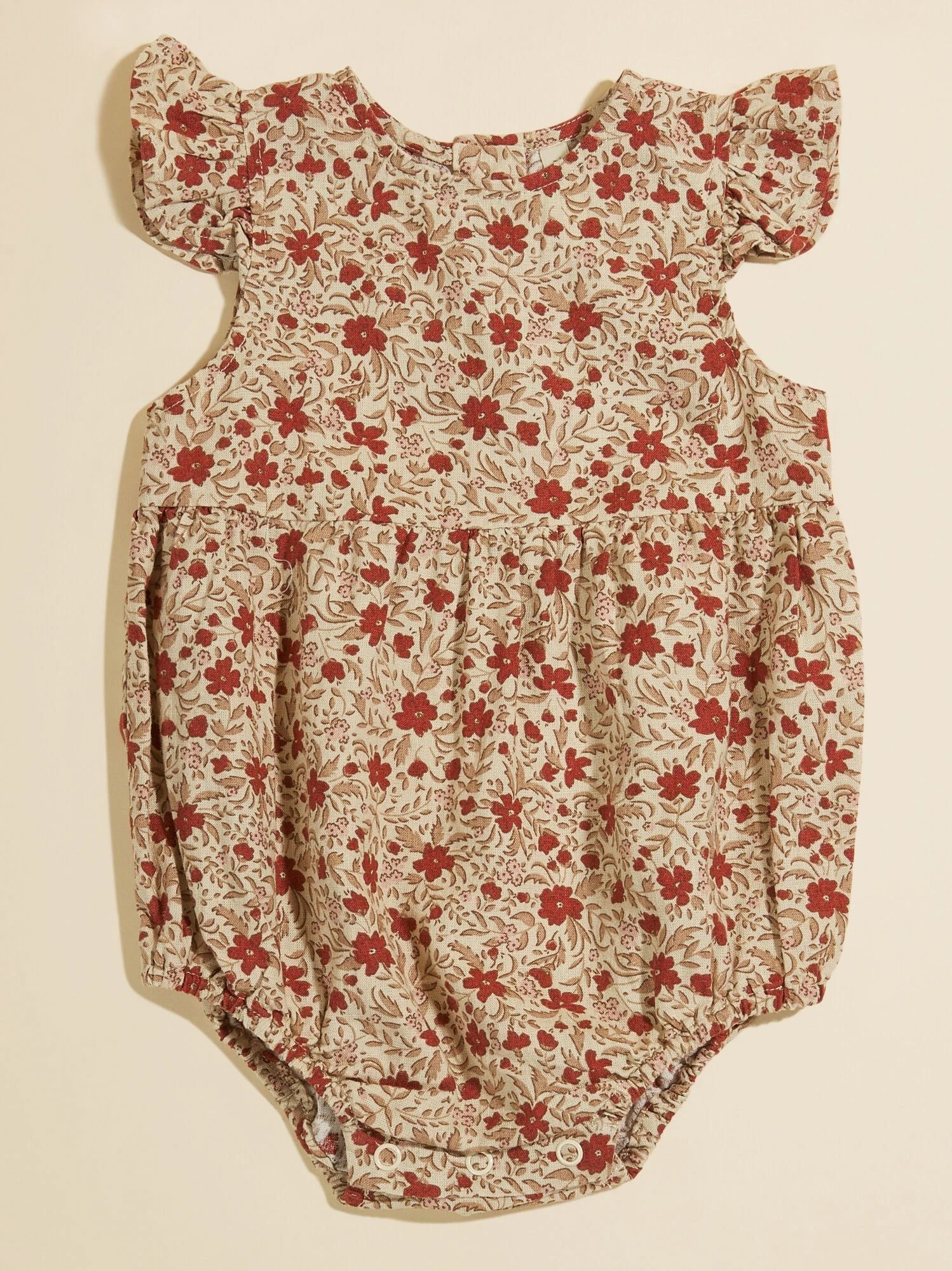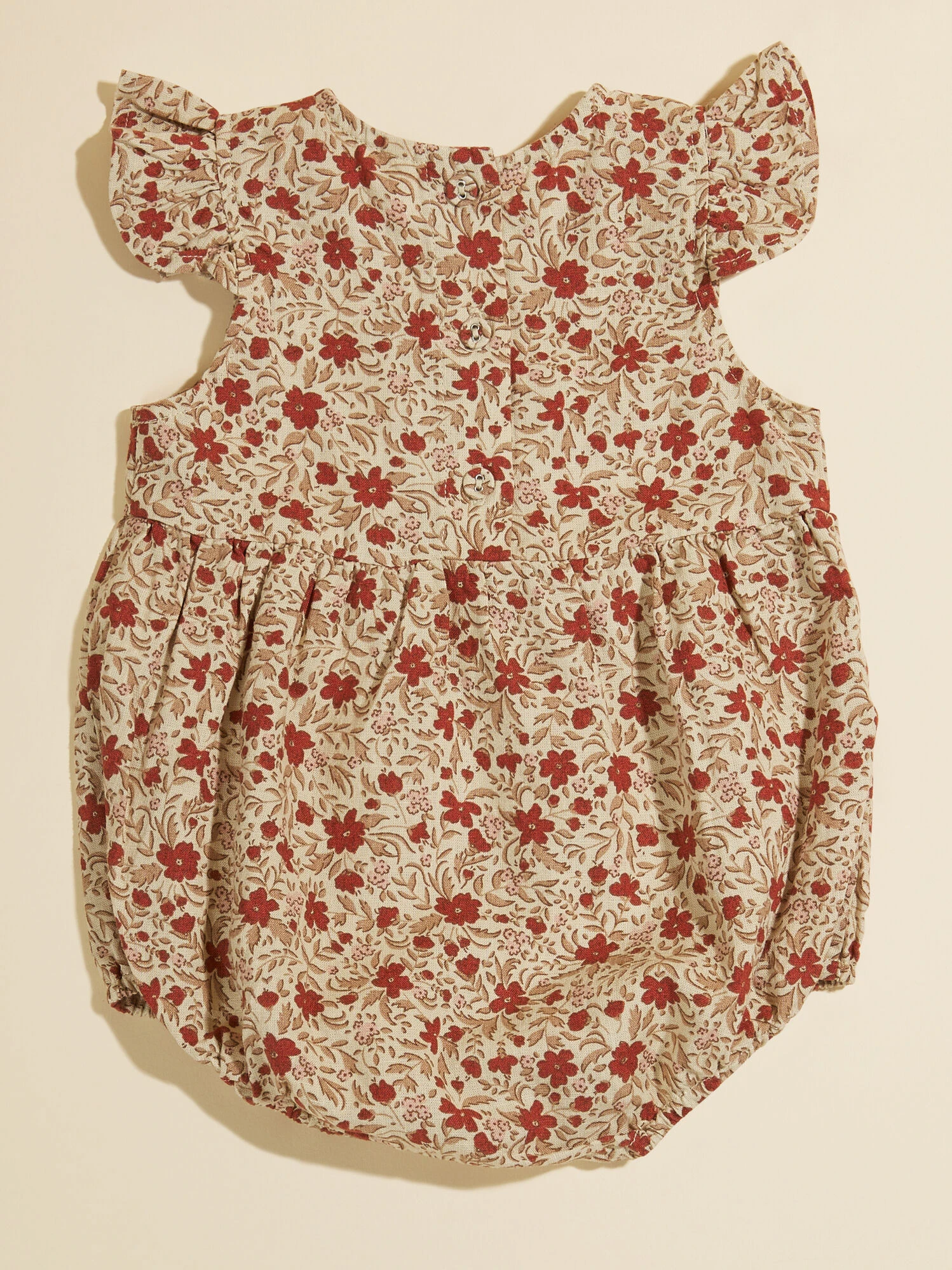 This woven one-piece romper features ruffle flutter details at the arm openings, a loose bubble shape with coconut buttons at the back, and an elegant floral print. Guaranteed to bring lightweight comfort to your girl, the breathable eco-friendly linen material stays cool during warm sunny days.