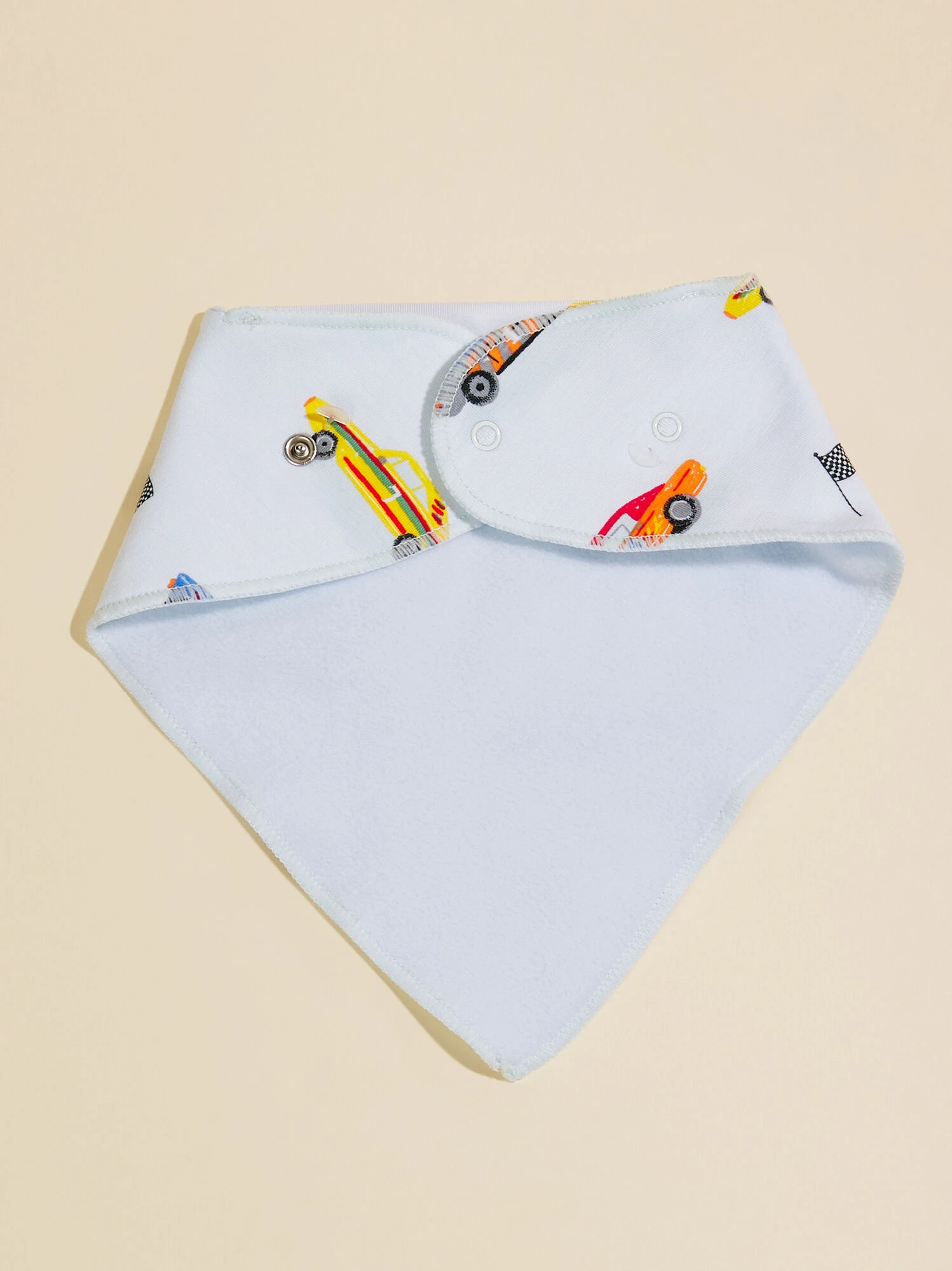 This buttery soft bandana bib, made from eco-friendly bamboo material, features a fun racecar print, perfect for your little one during snack time. The snapped closures make it super easy to put on and adjust, ensuring a snug and stylish fit while avoiding messes.