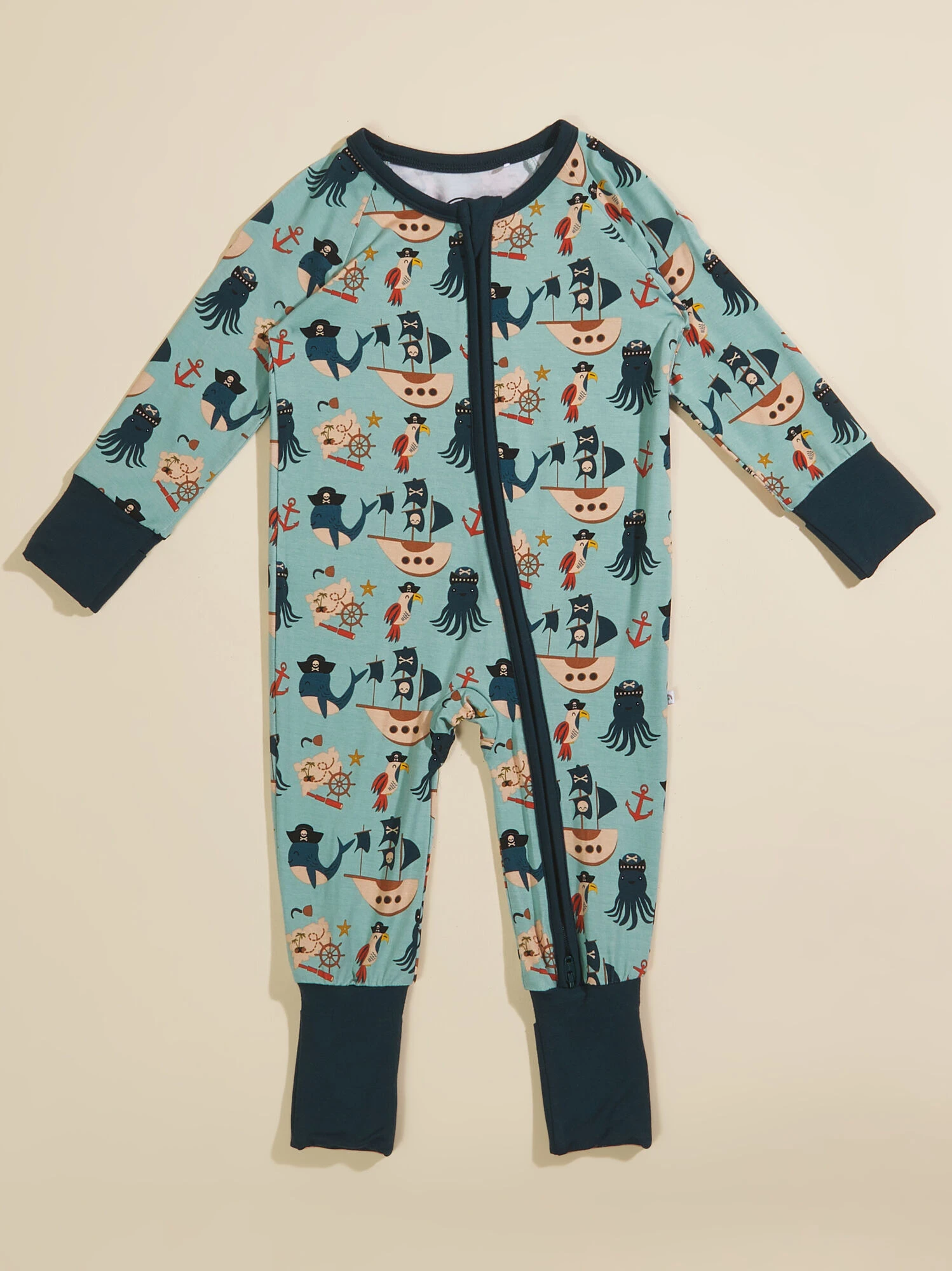 With a colorful, pirate inspired print, this sleeper offers a fun design while keeping your babe endlessly comfortable during bedtime with the buttery soft, lightweight feel. The eco-friendly bamboo fabric stays breathable on the skin, while the two-way zipper and fold over hand and foot cuffs ensure safety and easy dressing.
