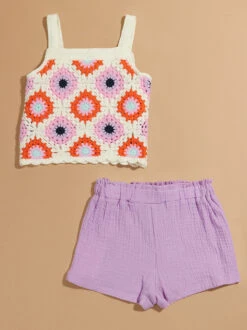 Get your little boho babe this sweet summer set featuring a crochet tank with a lightweight lining for a breathable feel, paired with soft shorts to complete the look. The elastic waistband provides an easy slip on style with side pockets for practical comfort.