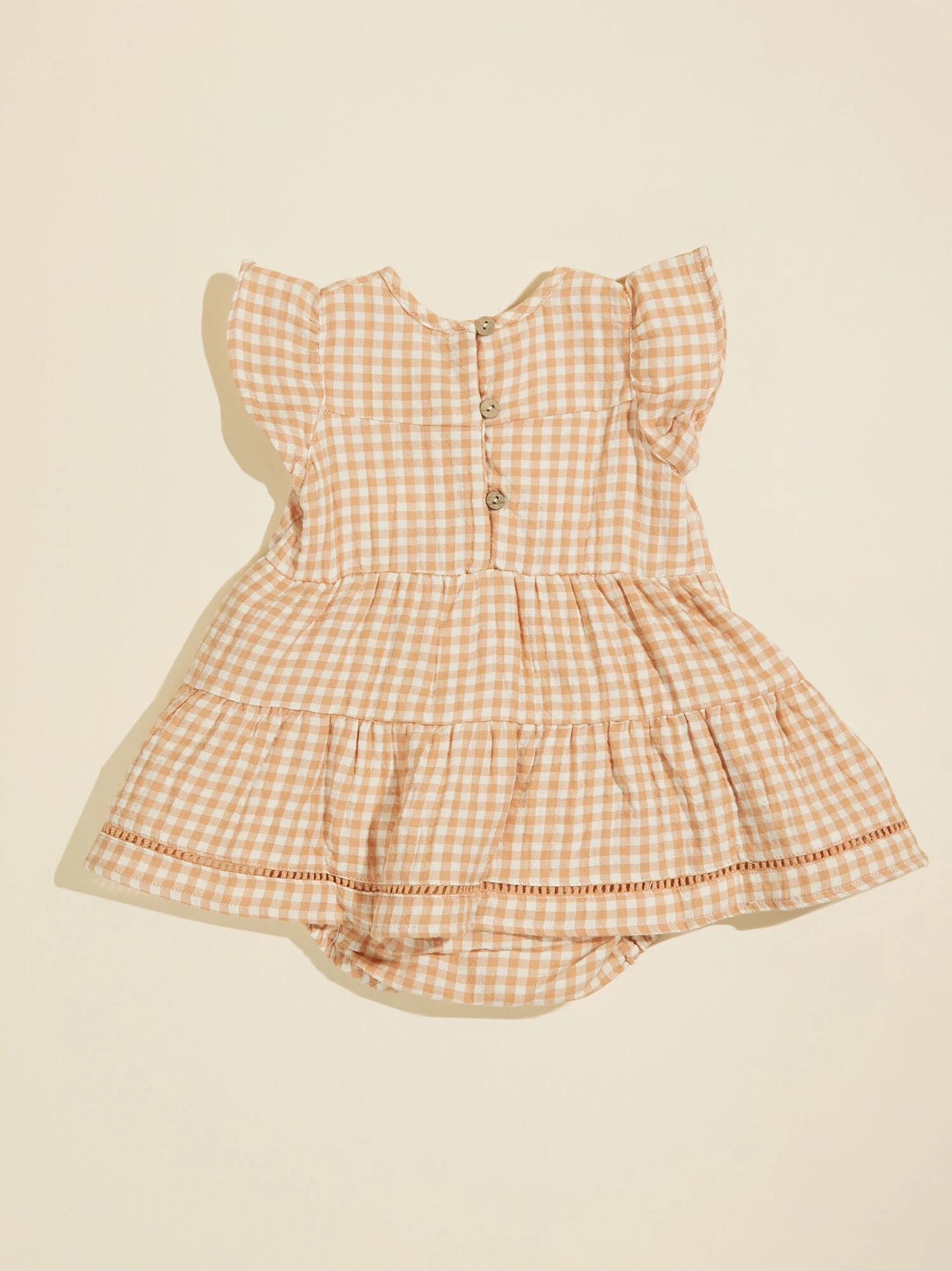 Dress your little darling in sweetness with this gingham dress and matching bloomer set. With ruffle sleeves and adorable tiers, this is the prefect one and done outfit, complete with convenient buttons on the back for easy changes ensuring both style and practicality for your little one.