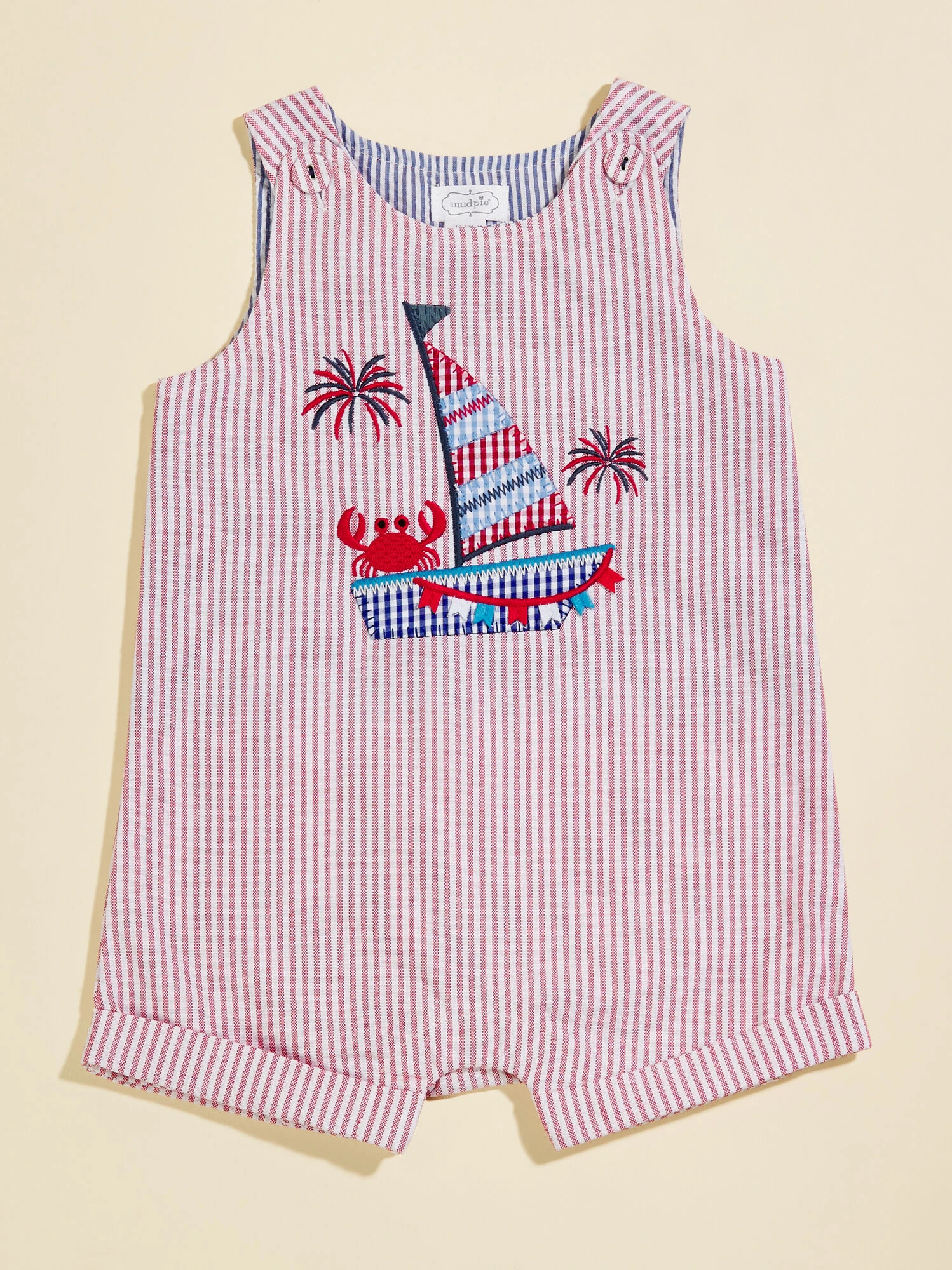 Grab this all in one outfit by MudPie featuring a red striped pattern, with a blue striped lining giving a fun patriotic look, perfect for an Independence Day celebration this summer season. The sailboat and crab patch will be your little’s favorite feature!