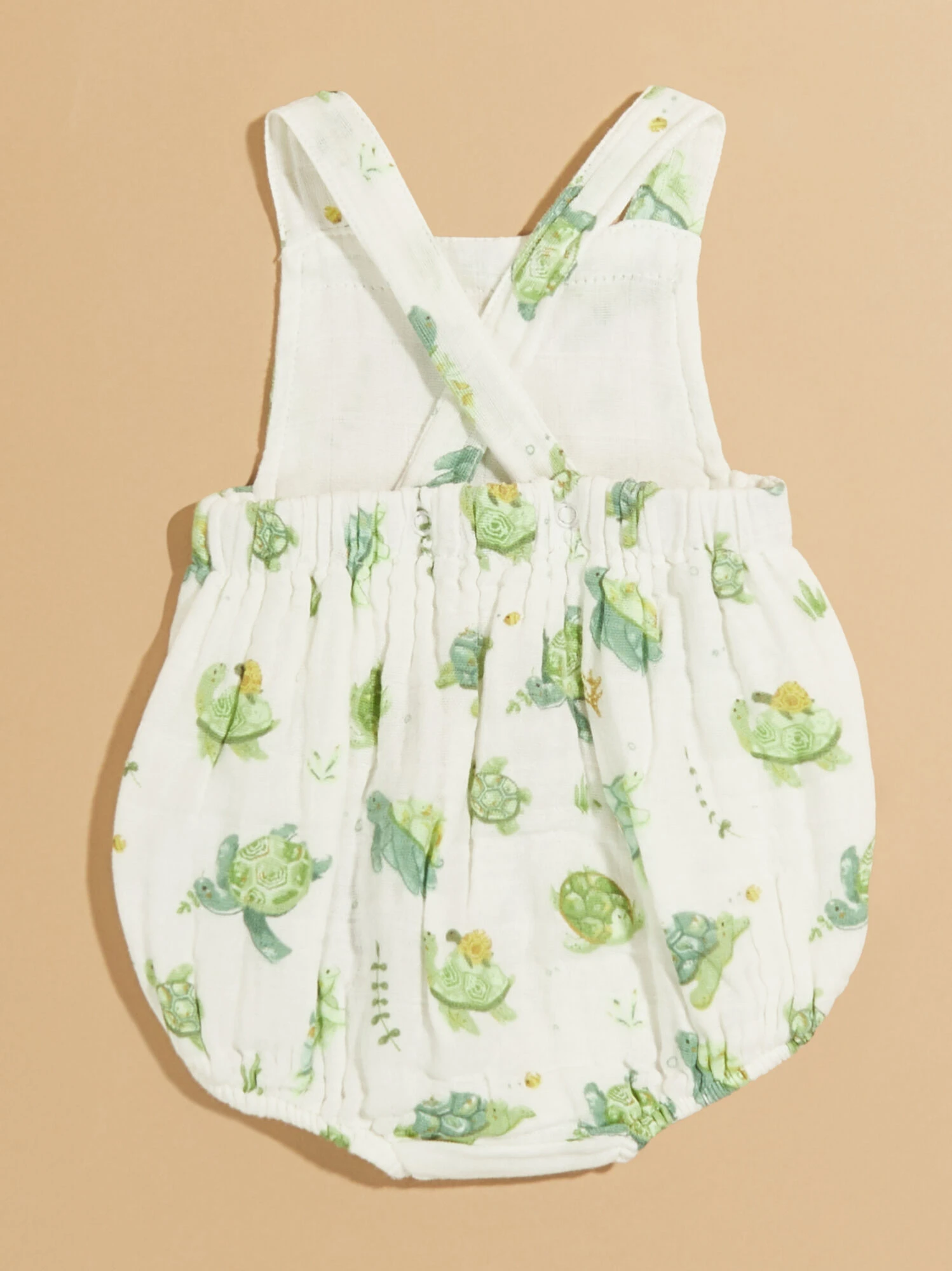 This adorable sunsuit designed with a sea turtle print is perfect for your little one’s sunny adventures. With convenient snap closures, dressing and changing your babe becomes a breeze, while the eco-friendly material provides a breathable feel. The cross back design with adjustable straps ensures both style and practicality for your babe.