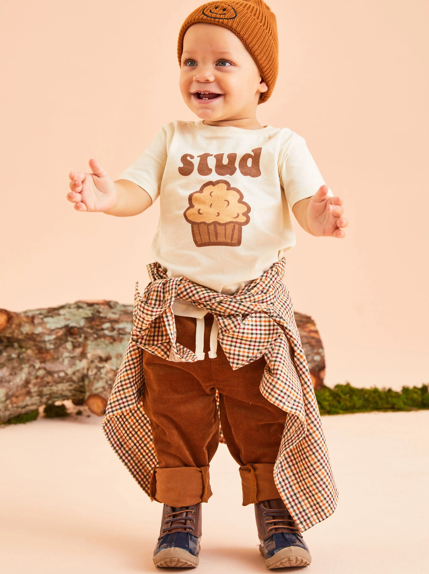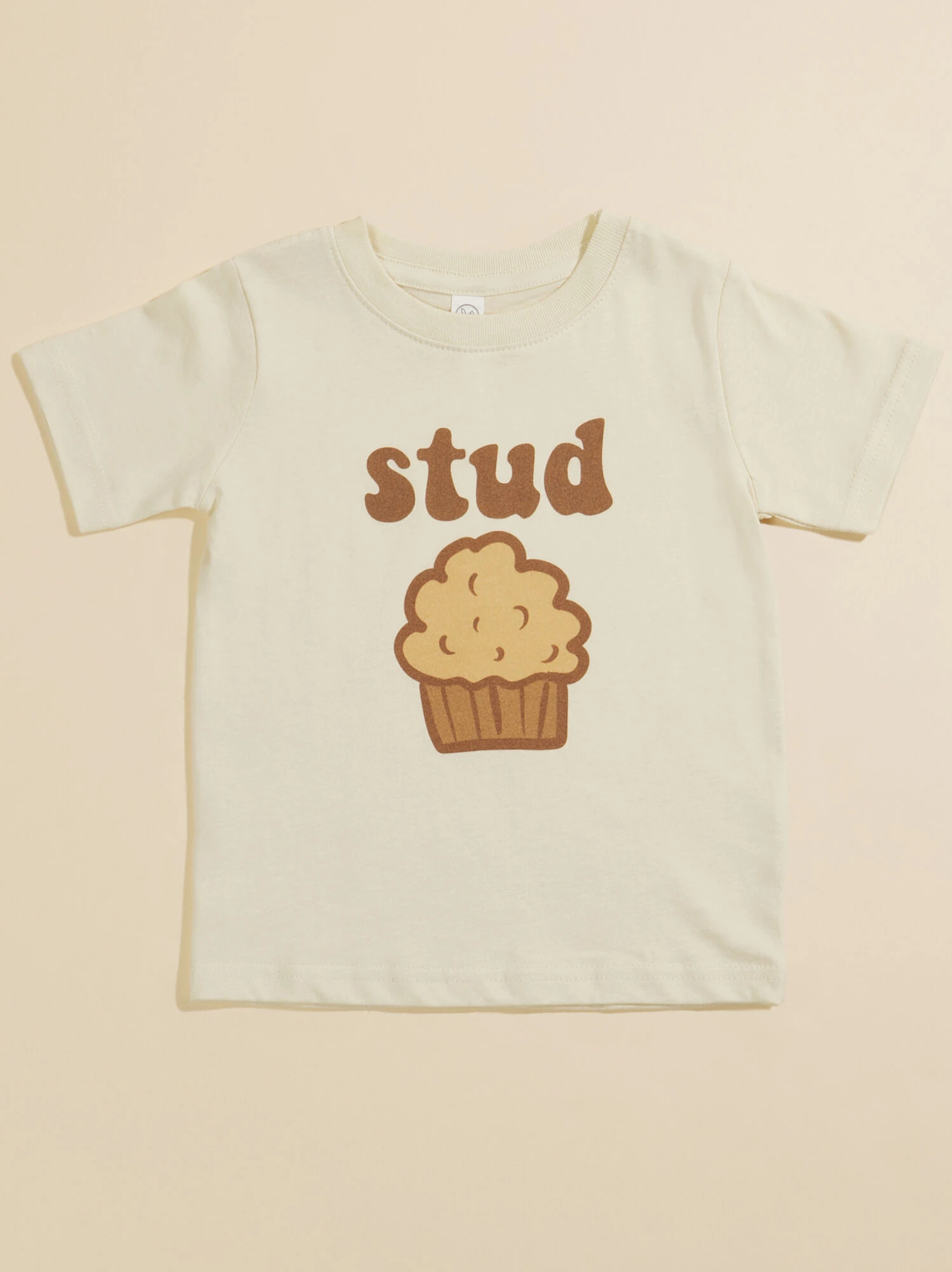 Get your little stud this simplistic graphic tee featuring bubble lettering. The soft, lightweight feel and ribbed neckline offer all day comfort with ease and stretch for playtime!