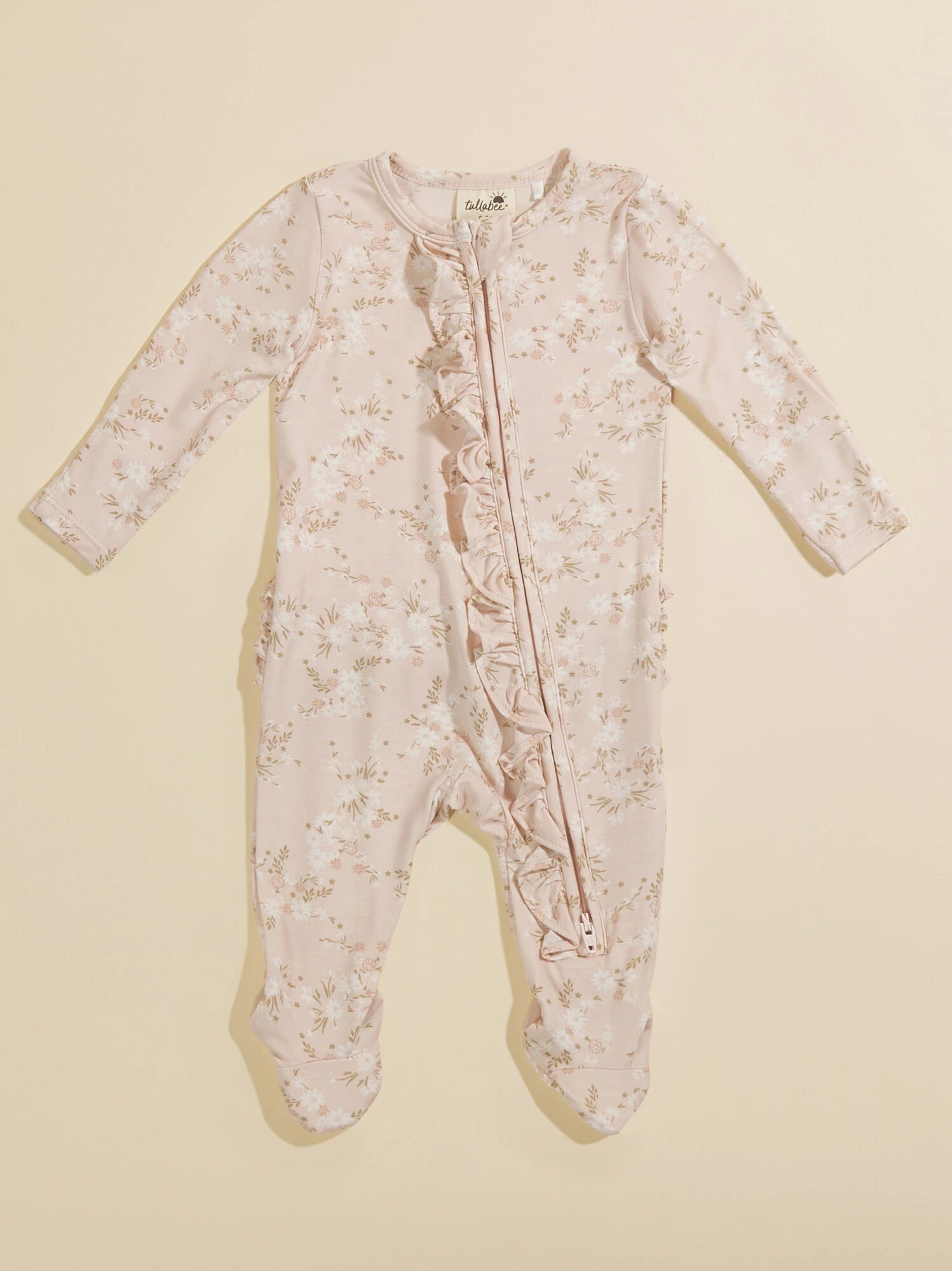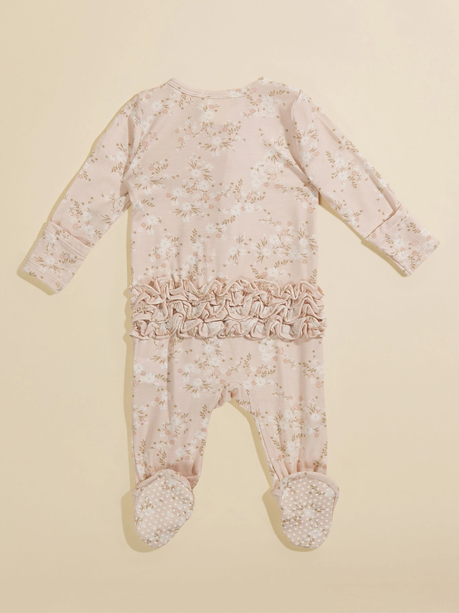 This sweet floral one-piece with ruffle accents brings an elegant look to bedtime for your babe. The lightweight eco-friendly fabric from bamboo provides a buttery soft feel, while the two-way zipper and fold over hand cuffs meet all your practical needs.