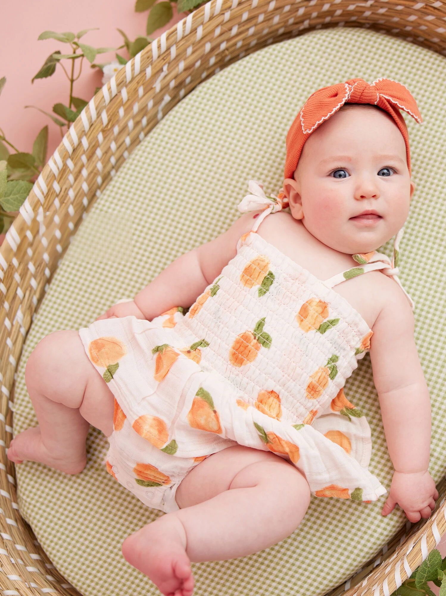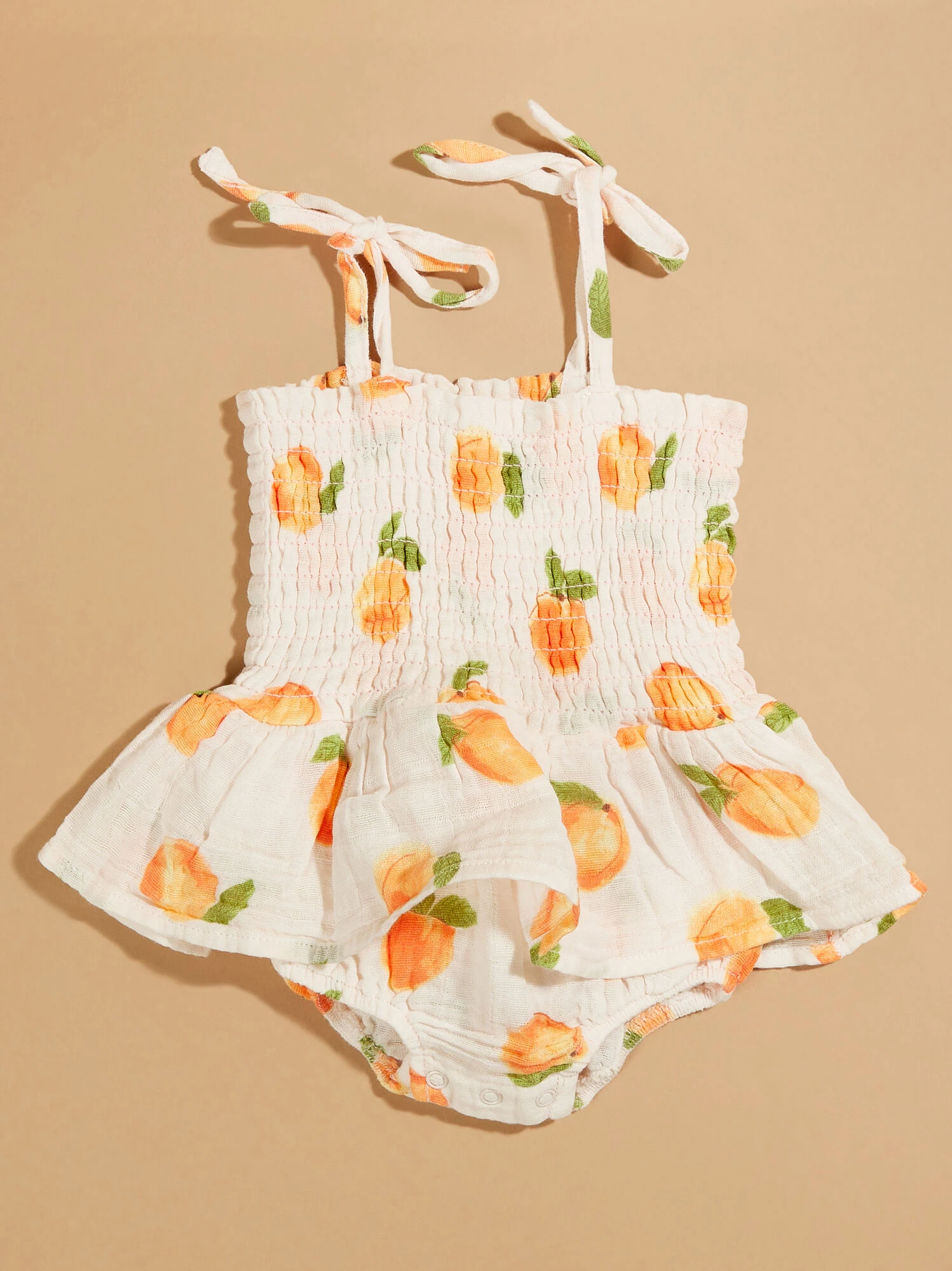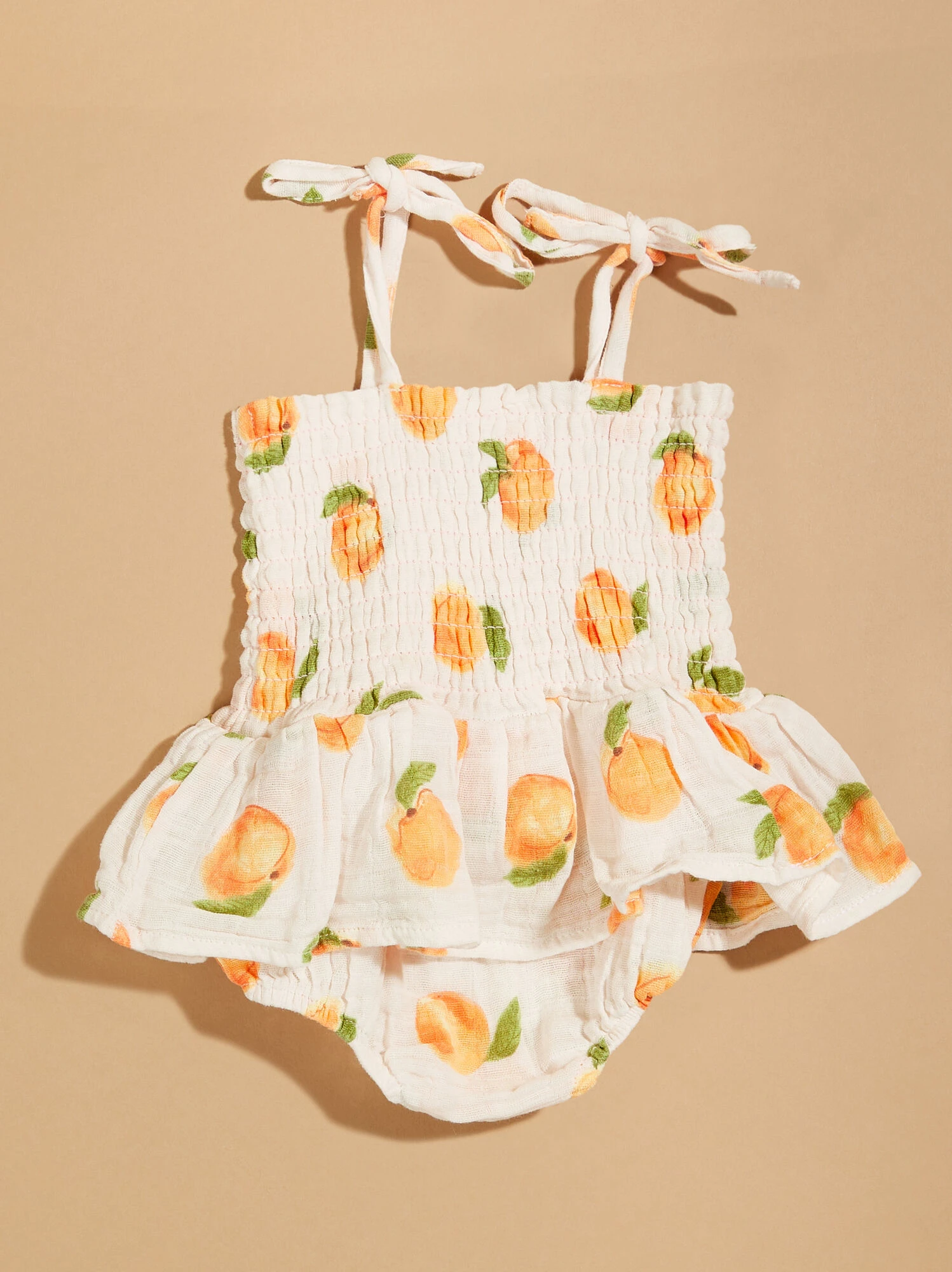 This all in one outfit is the cutest pick for your girl this season with the smocked bodice and elegant skirt layer in a sweet peach print. The adjustable tie straps allow a customizable fit, while the lightweight organic cotton material provides breathability and maximum comfort for your babe.