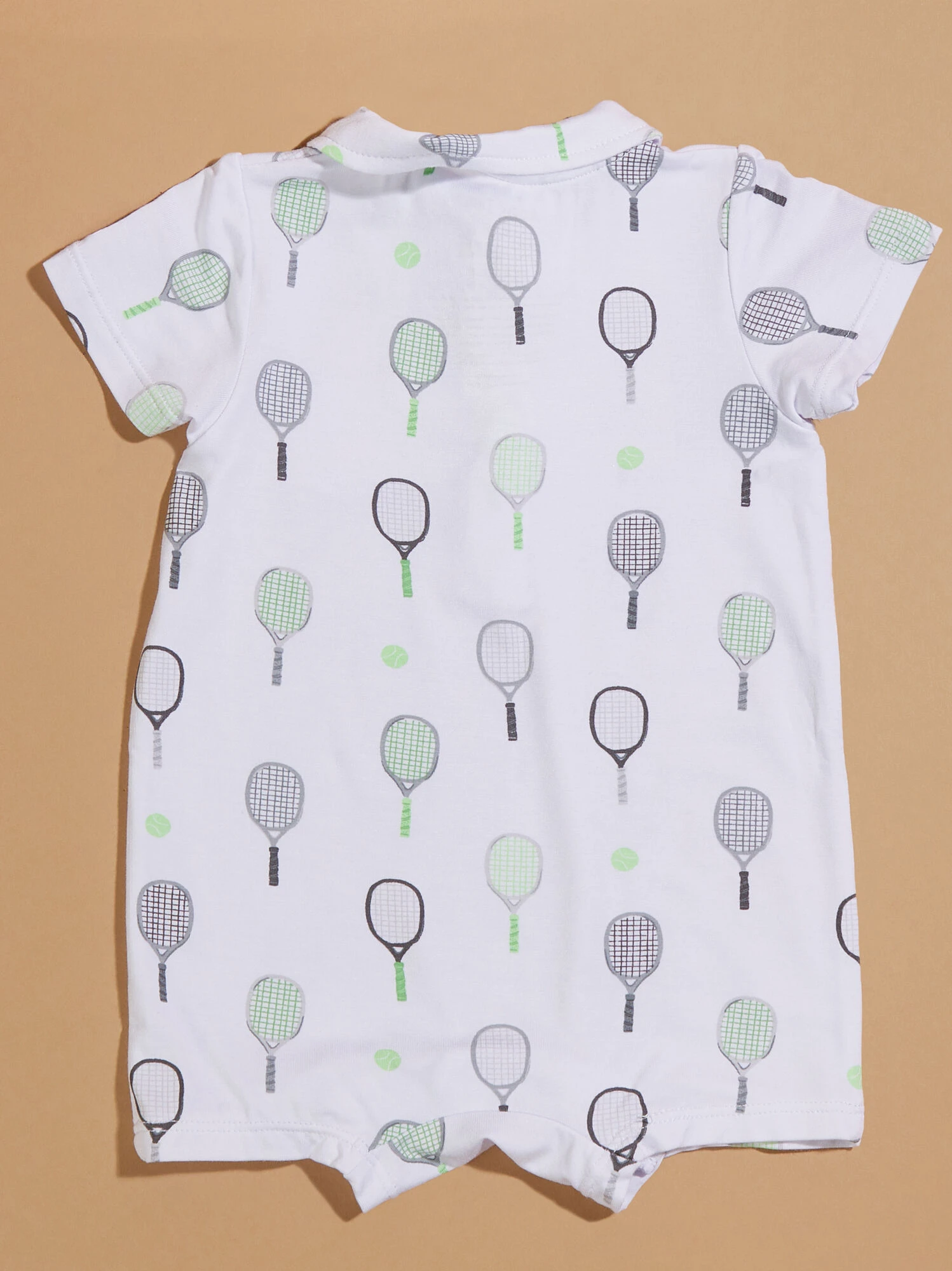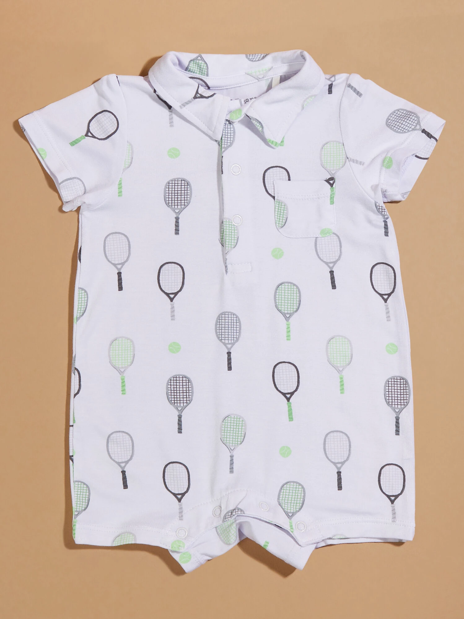 This adorable jumper features a tennis racket and ball design, adding a sporty touch to your little one’s wardrobe. The eco-friendly bamboo material provides buttery soft comfort, while the convenient front pocket and preppy collared neckline, make this one-piece the cutest look for outings or lounging at home.