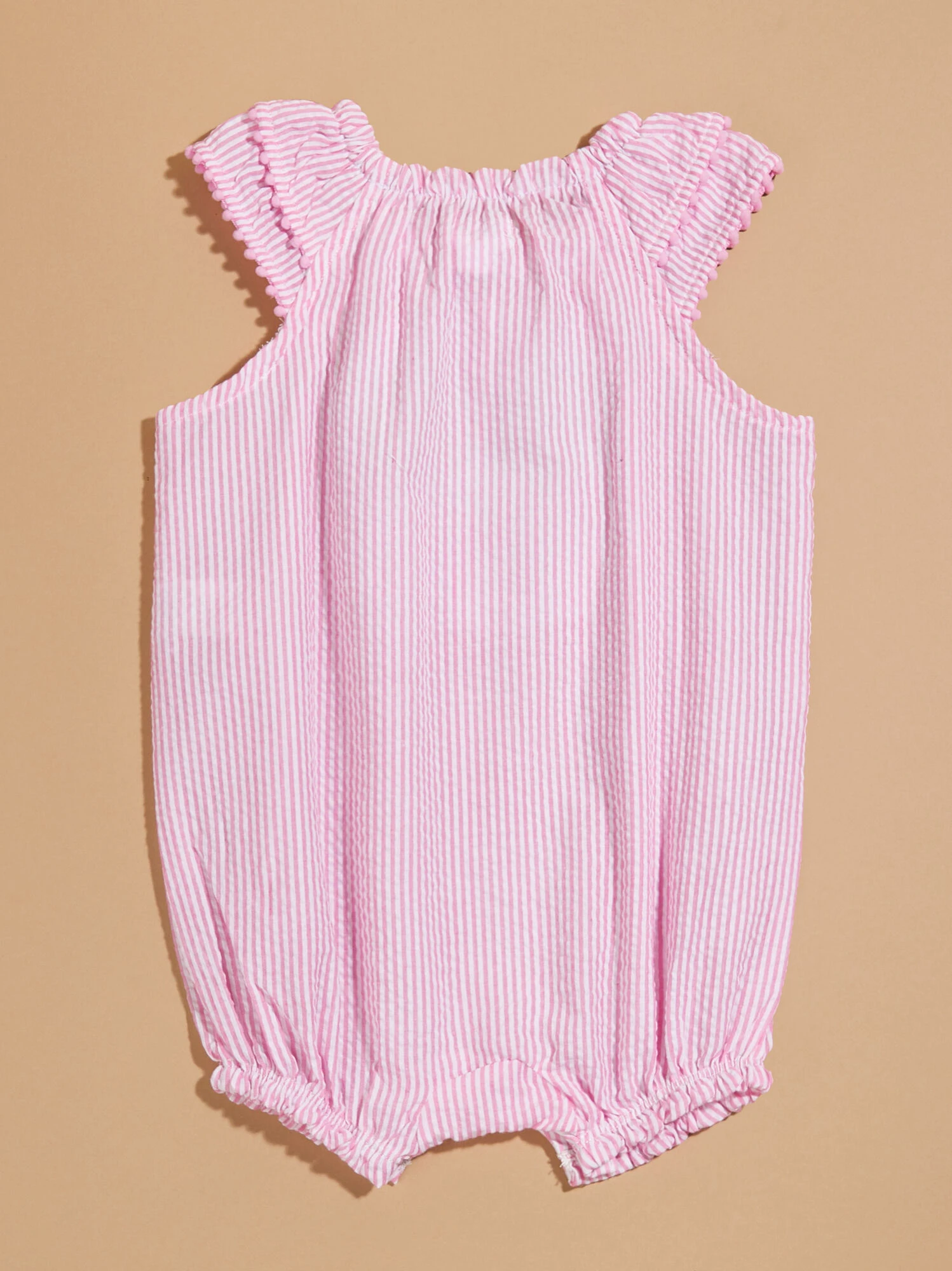Ace the day with this adorable outfit featuring a unique design on seersucker fabric. Designed for your sporty girl that’s layered flutter sleeve with pom-pom trim, adds a playful touch to the overall look. Additionally this jumper snaps along the inseam for easy diaper changes.